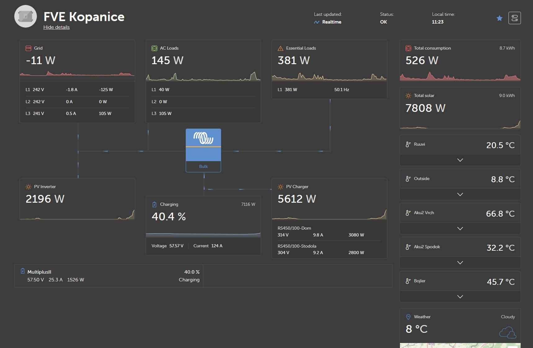 24x Solární panel JINKO SOLAR 225 Pmpp=225W, 2x Regulátor STUDER VT-80, 2x Střídač Studer XTM 4000-48, BSP, RCC, 1x AKU 48V LFP200Ah 1x AKU 48 V LFP280Ah. Řizení a dohled, SDS, vlastní vyčítání arduinem DUE v krabičce (ARMOSY), export dat do RPi s databází a html stránkou.