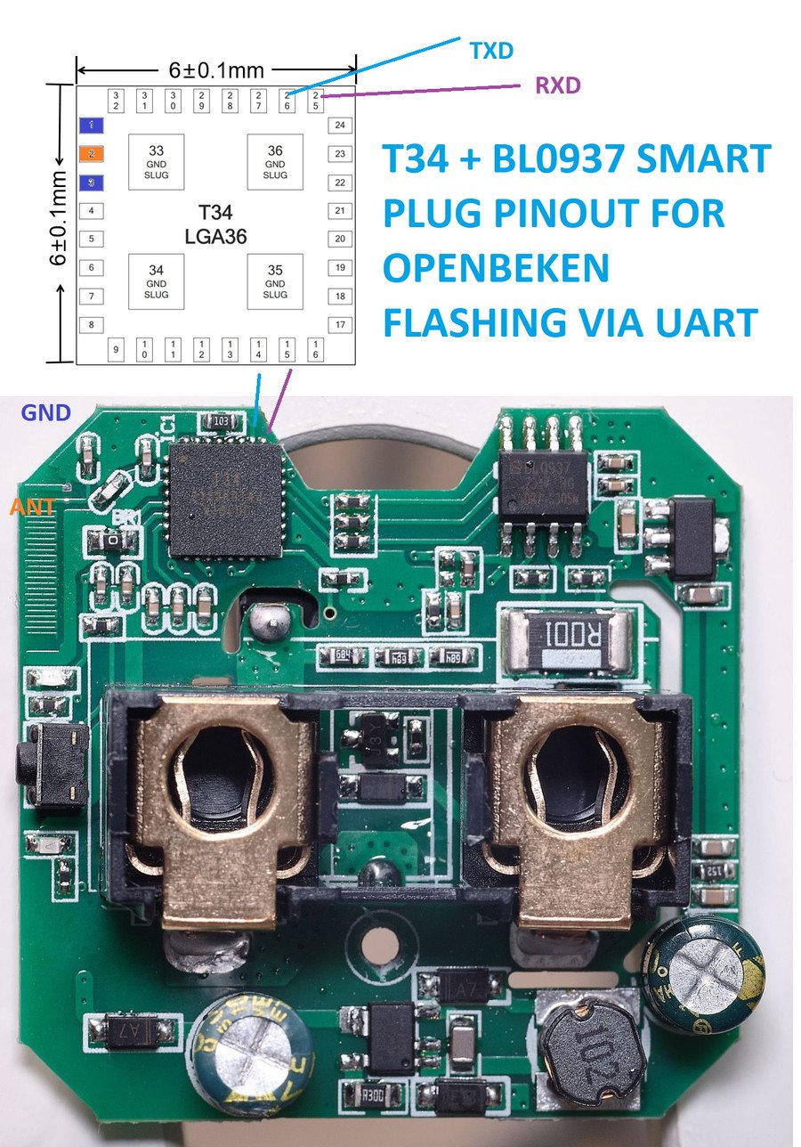 V skratke, je tam SoC (system on chip) T34 ktorý obsahuje Beken BK7231N, power monitor BL0937 a žiadne programovacie pady na PCB - takže mikroskop a ide sa na to. Podľa datasheetu a článku [T34/BL0937] Teardown Generic Wifi Smart Plug with Energy Measurement + ESPhome device configu som to naflashoval s ESPhome a už aj to fičí.