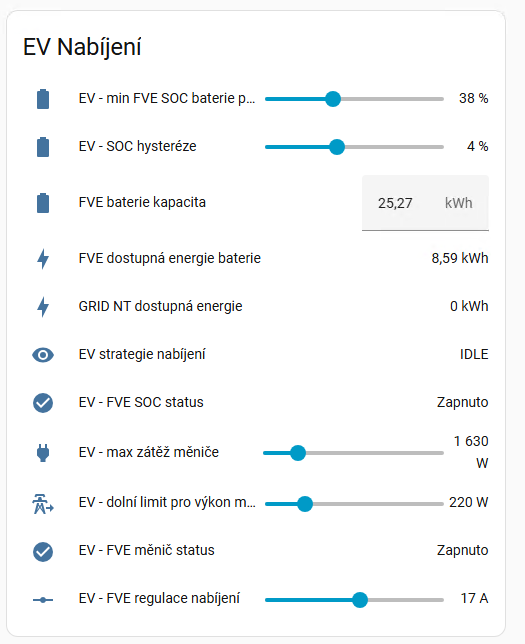 Když svítí slunce, tak 1f "wallbox" z Číny až 32A - zatím jsem na něm nastavil maximum 25 A. Když nesvítí, tak z baterek nechci tahat dlouhodobě víc jak 100 A. A pokud není dost elektřiny, tak dobíjím od distributora z jiného čínského "wallboxu" 3x16 A v době nízkého tarifu. Můžu to všemožně zautomatizovat přes Home Assistant, ale zatím jsem neměl potřebu.