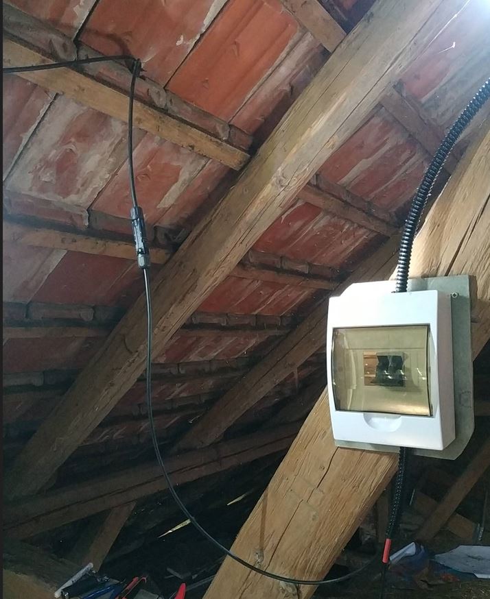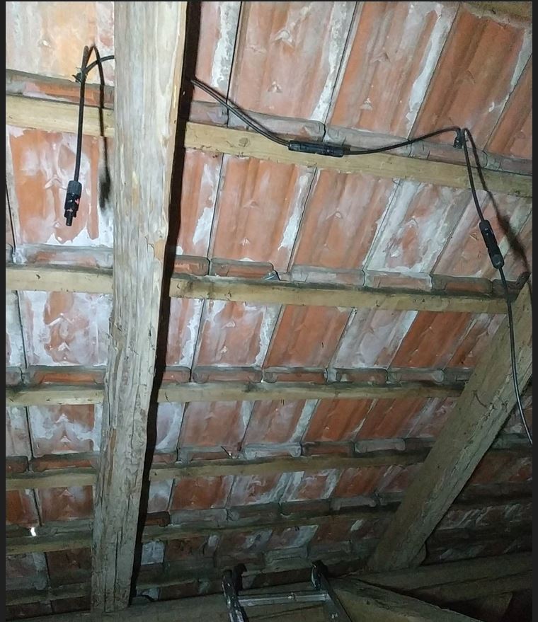 Do krabičky zatéct nemůže, přívod od panelů je zespodu - jak lze vidět na poslední fotce. A ani odtamtud téct voda nemůže. Vývod z pojistkové krabice nahoru je právě směr do technické místnosti. Je to komplet pod střechou. Z krabičky to vede nejprve nahoru, pak po kleštině na druhou stranu a zase dolů a pak po pozednicovém trámu pryč.