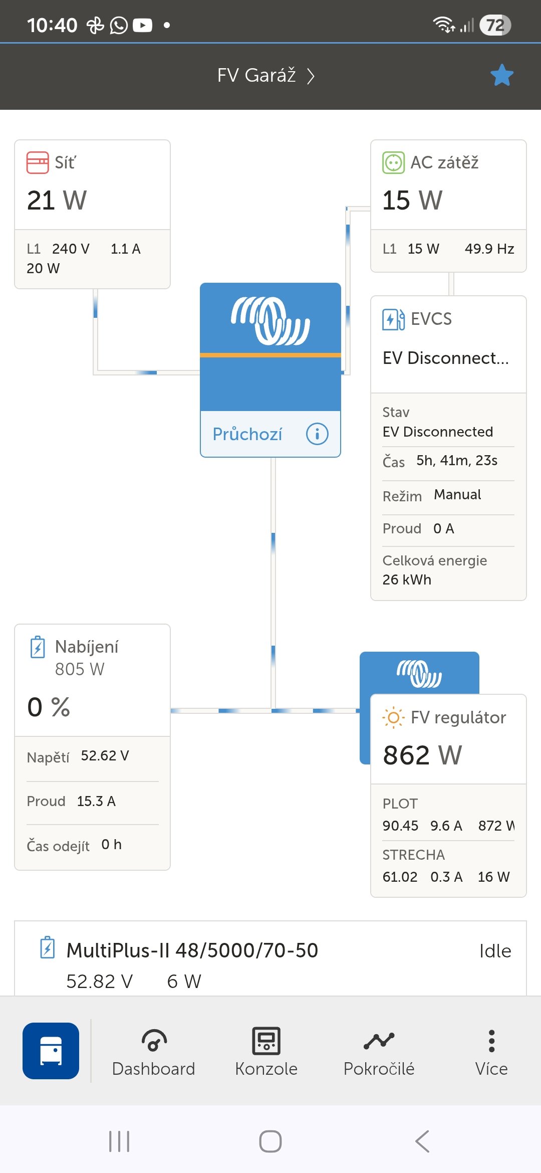 15 kWp JJZ + 3x Tristar MPPT60 + Victron 150/100 + 48V LiFePO 850 Ah + UPS 8kW (MPP-Solar 8048 LC) + 4 x nabíječka 1,2 kW (DELTA) Start: 2012