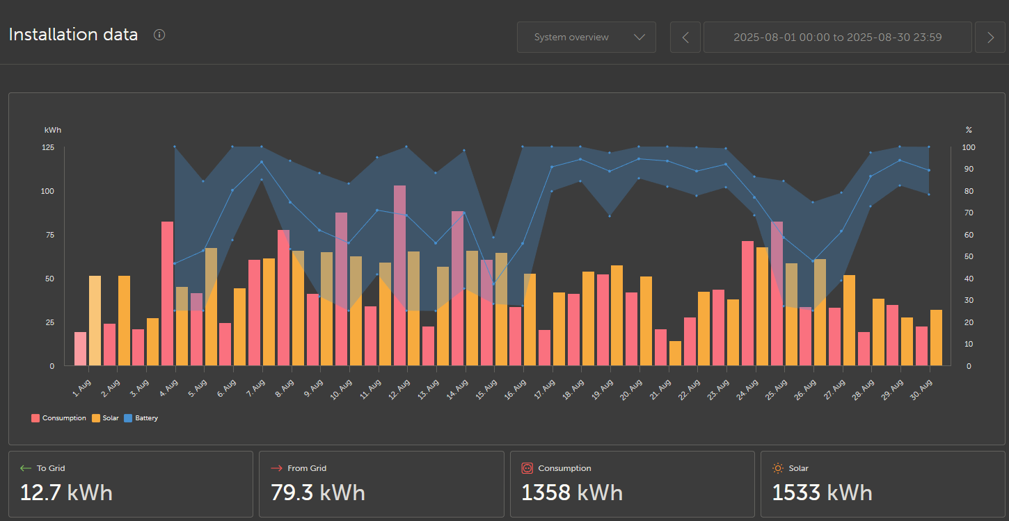 Přes den jsem z domu pryč, nabíjím v noci v době platnosti NT většinou 3x10A, když je něco v úložišti, tak se to využije, přes léto mi úložiště vystačí pro dům i BEV, v zimě naopak v době platnosti NT jej dobíjím a jedu z něj přes den.