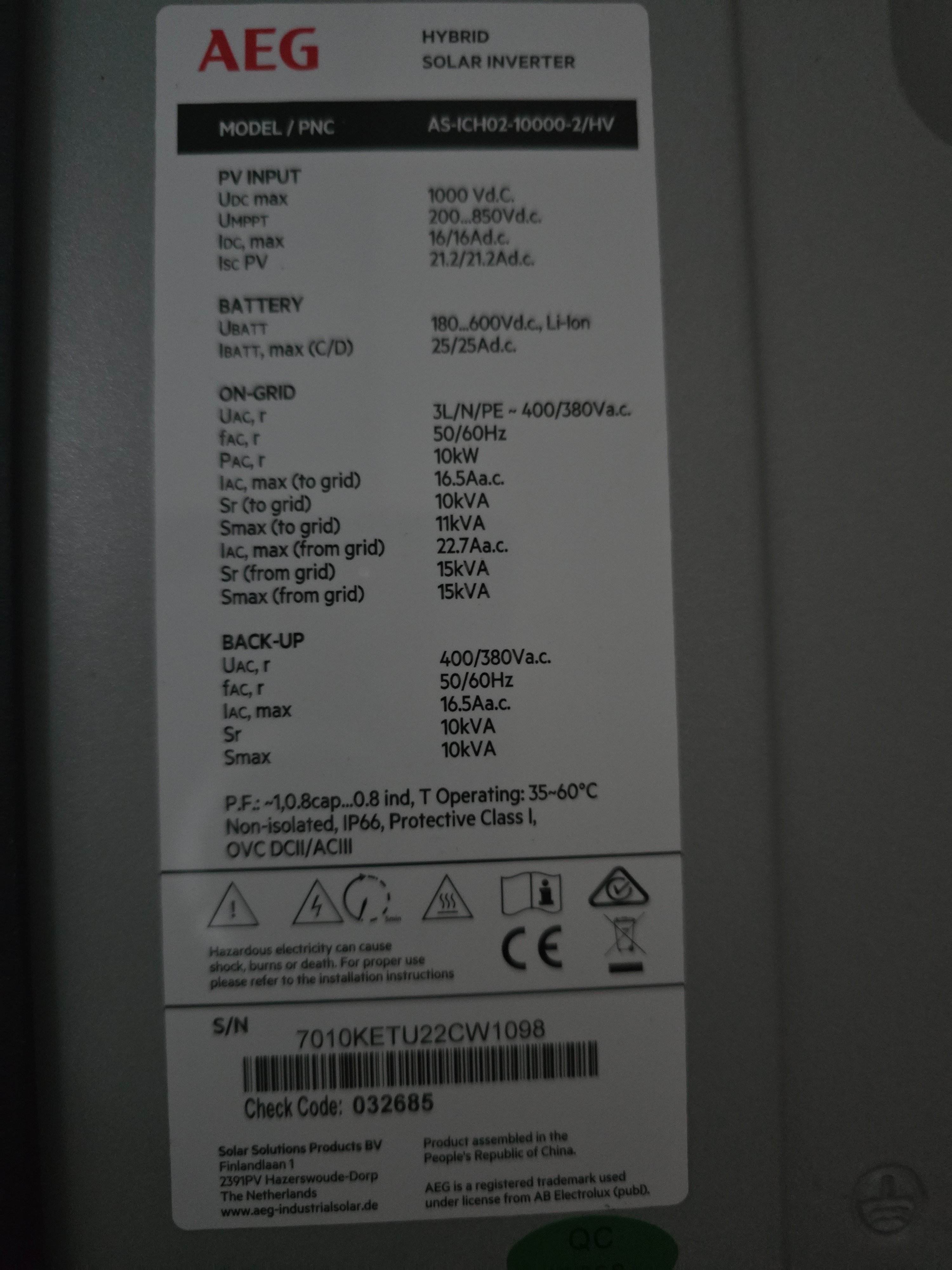Jedná se o střídač AEG, model AS-ICH02-10000-2/HV (viz výrobní štítek).