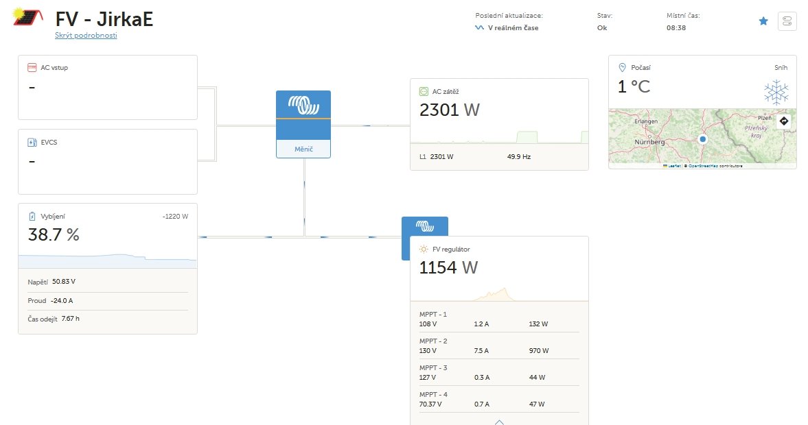 Přepínač je uplnĕ mimo Fv.Ten wallbox je v systému pořád vidĕt a mĕnič je vypnutý.JirkaE píše: čtv úno 19, 2026 5:52 pmFranto a ty 3F měříš také Victronem ? Nebo to už je přes ten přepínač sítí právě úplně mimo FV ? Jedna poloha přepínače - 1F FV a druhá poloha 3F DSFranta2776 píše: čtv úno 19, 2026 4:47 pmJeštĕ k tomu Victronu.Obĉas potřebuji rychleji nabít např přijedu v noci a ráno odjezd.Tak jsem si na ruční přepínač na wallbox přivedl DS 3fáze.11kW nabíjení.Zkoušel jsem jednu fázi odpojit a nabíjet na 2 fáze.Že bych EV živil ze dvou mĕničů.Ten wallbox to nepustí a i když má připojený 2 fáze tak nabíjí pouze z jedné fáze max 16A.Pokud vidi 2 fáze nevyužije ani plnou kapacitu 32A.