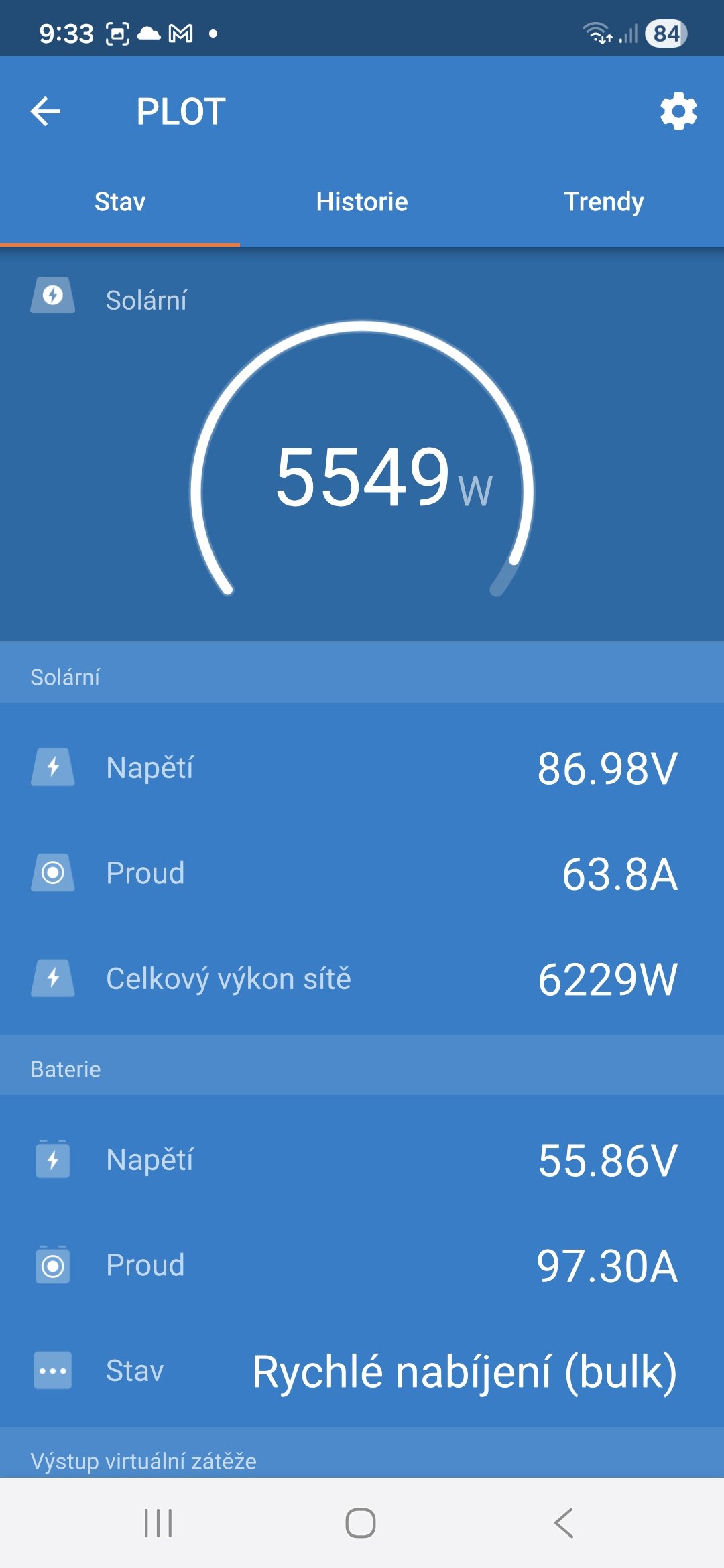 ostrov skoro 8kWp neustále ve stádiu zrodu: smartshunt(ex WBJR), MPPT150/45, MPPT 250/100(ex midnitesolar 150 clasic lite), 16S a různě P cca 340Ah Winston, MP II 5000,( ex Powerjack 8kW, ex samodomo cca 4kW). 48V DC rozvody a spotřebiče.