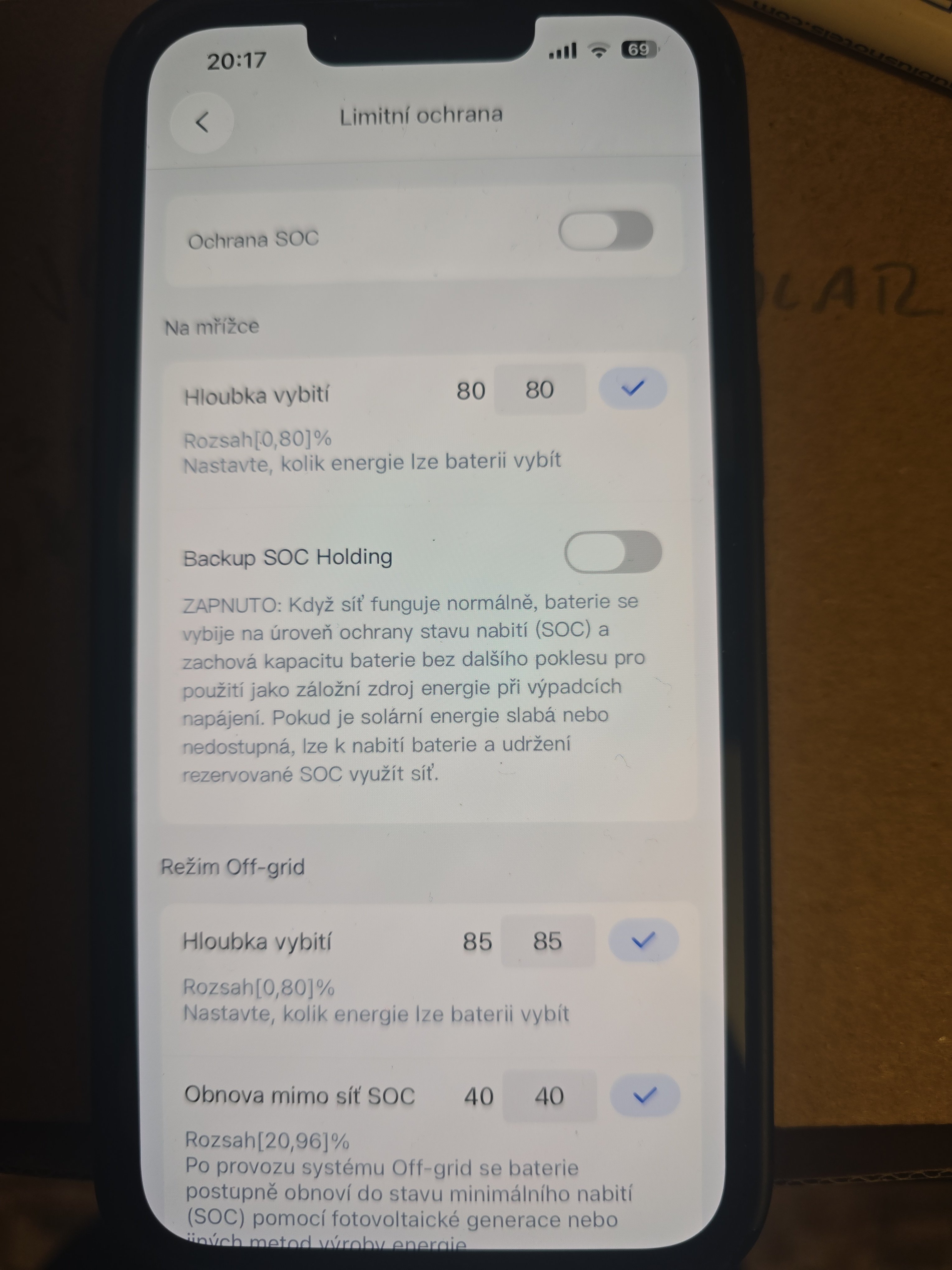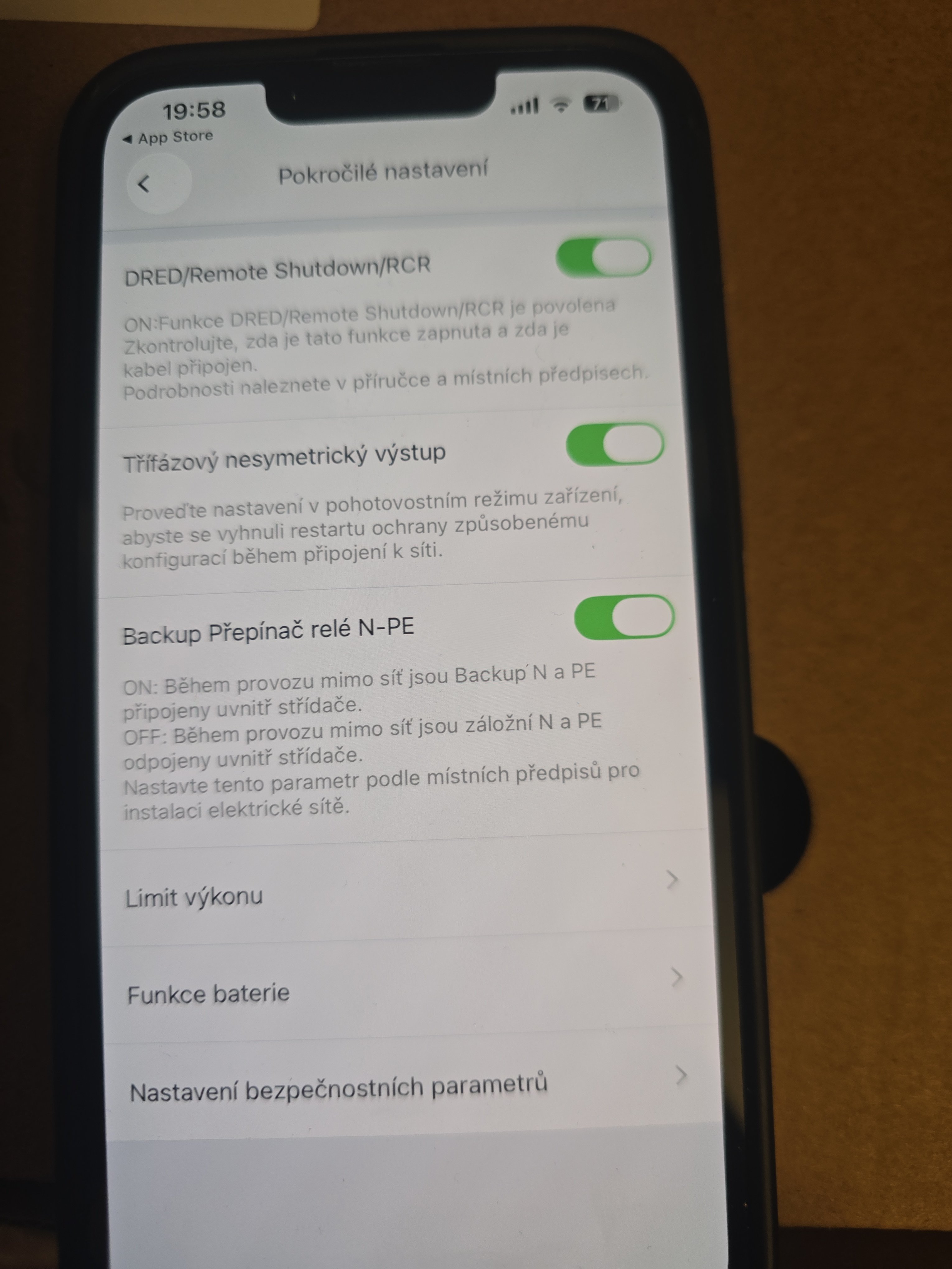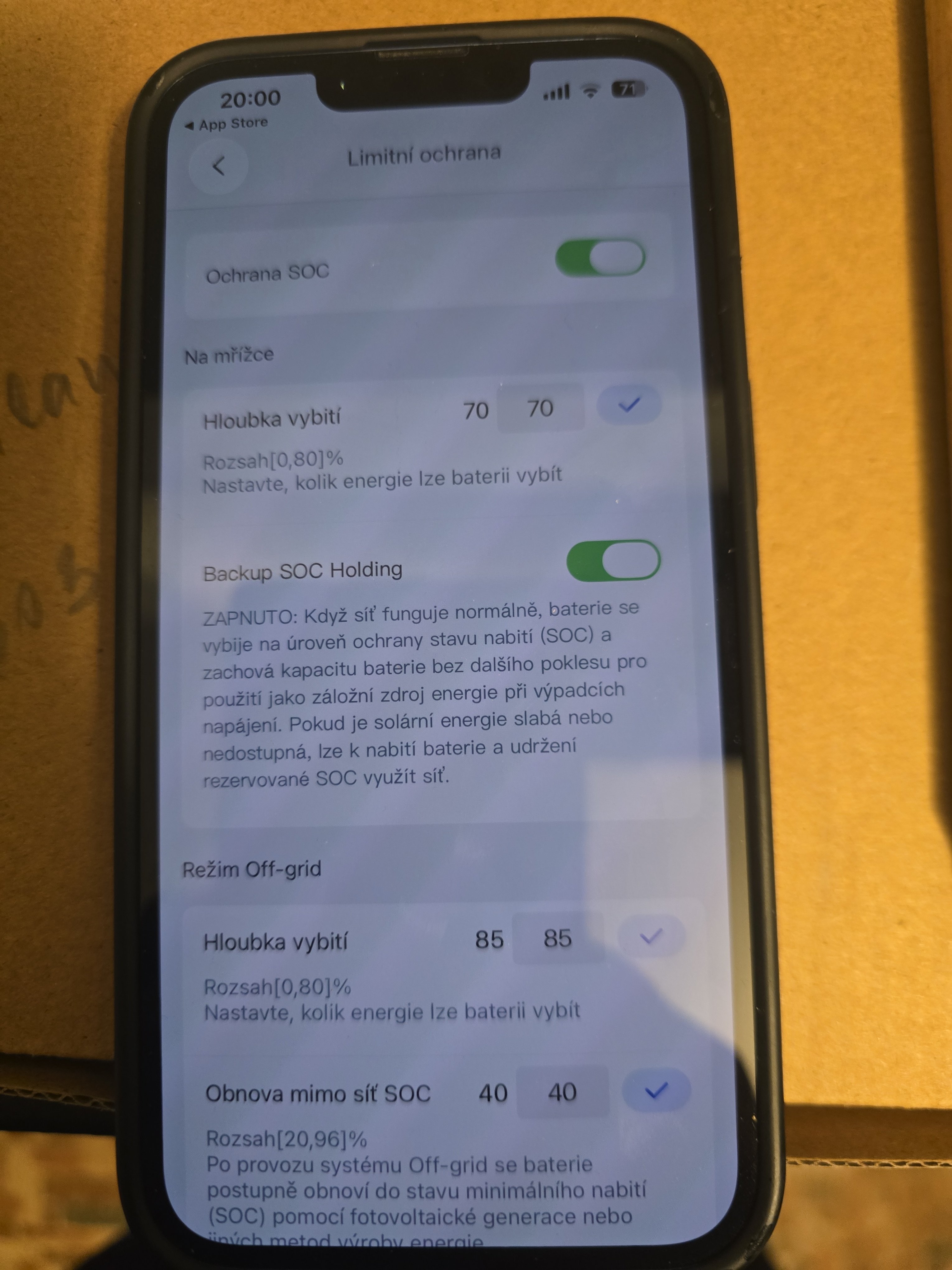K příspěvku přikládám screenshoty z aplikace (CT test, SOC, tok energie, nastavení Limitní ochrany).