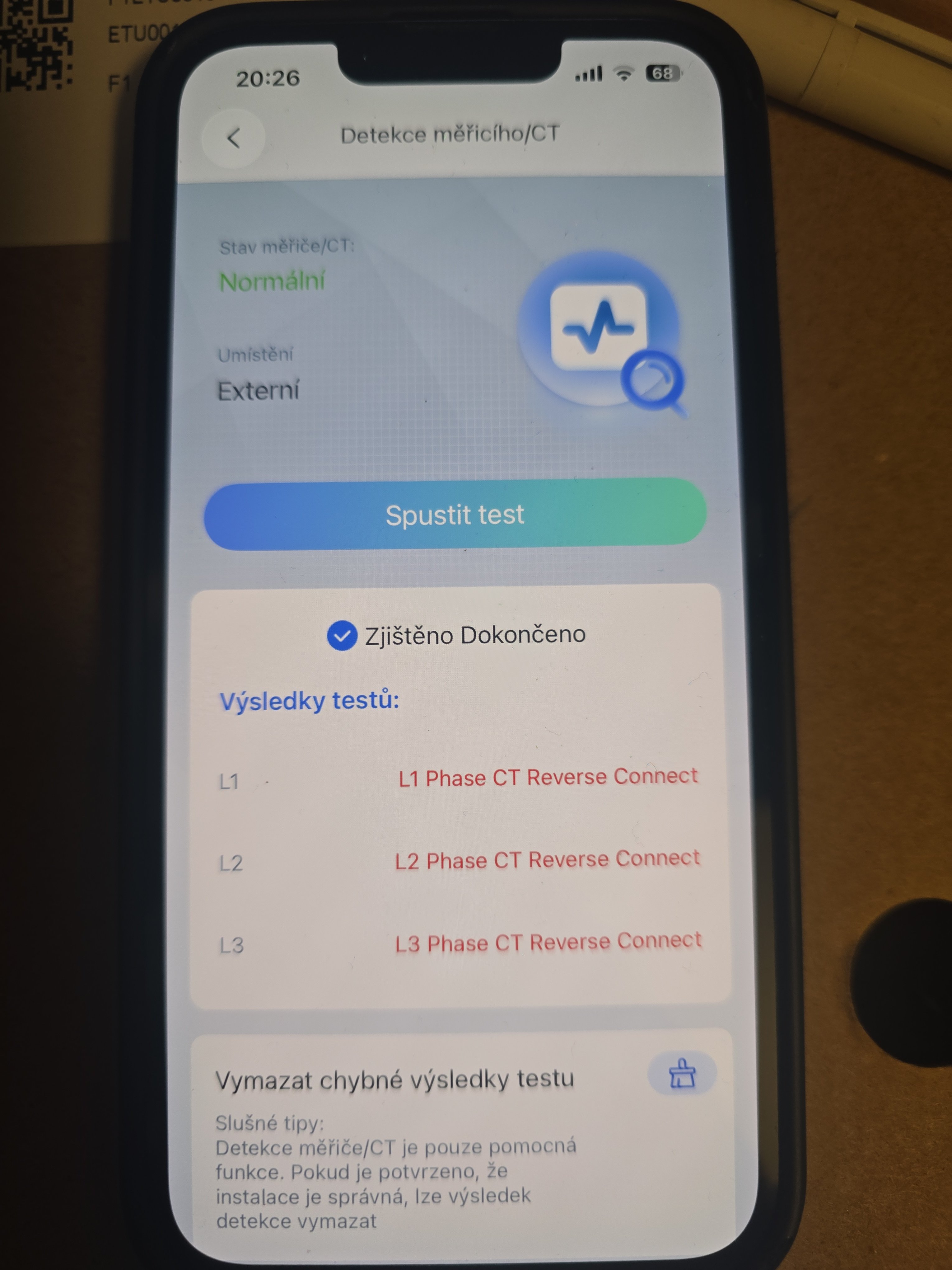 Včera jsem byl u otce na baráku a řekl mi, že baterie se vůbec nevybíjí, je pořád na 100 % SOC a dům je napájen ze sítě. Připojil jsem se proto do střídače přes aplikaci WE Mate a snažil se zjistit, kde je problém. Provedl jsem základní kontrolu nastavení a následně CT detekční test, po kterém aplikace začala hlásit chybu na všech fázích.