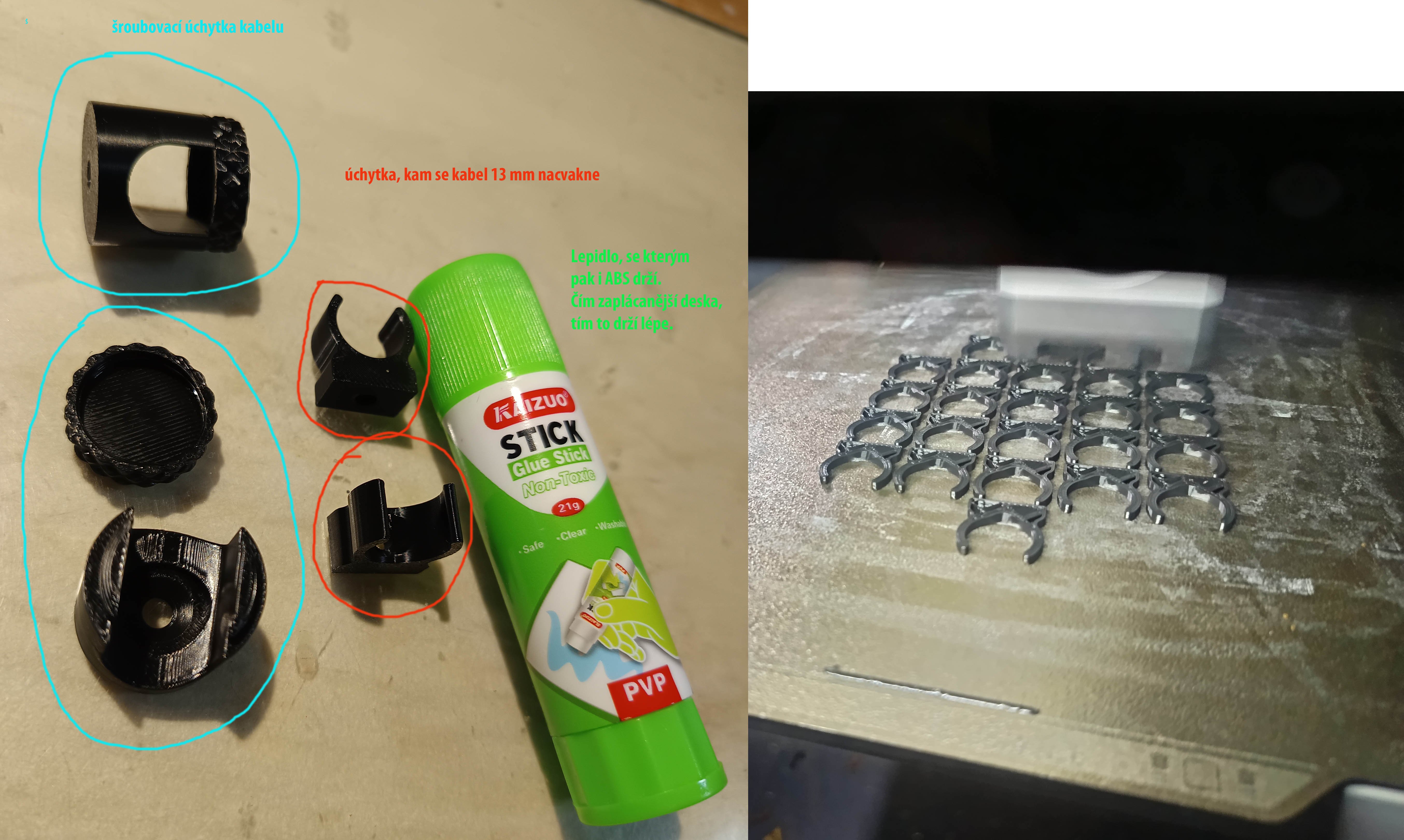 Na netu jsem narazil na ten vlevo https://makerworld.com/cs/models/404170 ... eId-305889 , ten je šroubovací a fajn, ale ten vpravo je na materiál ještě úspornější. Koukám, že 3D tiskárna je užitečná a dost využívaná. Na podložce mi ABS drží, když je pořádně zasviněná od lepidla a předchozích tisků. Na čisté to nedrží.