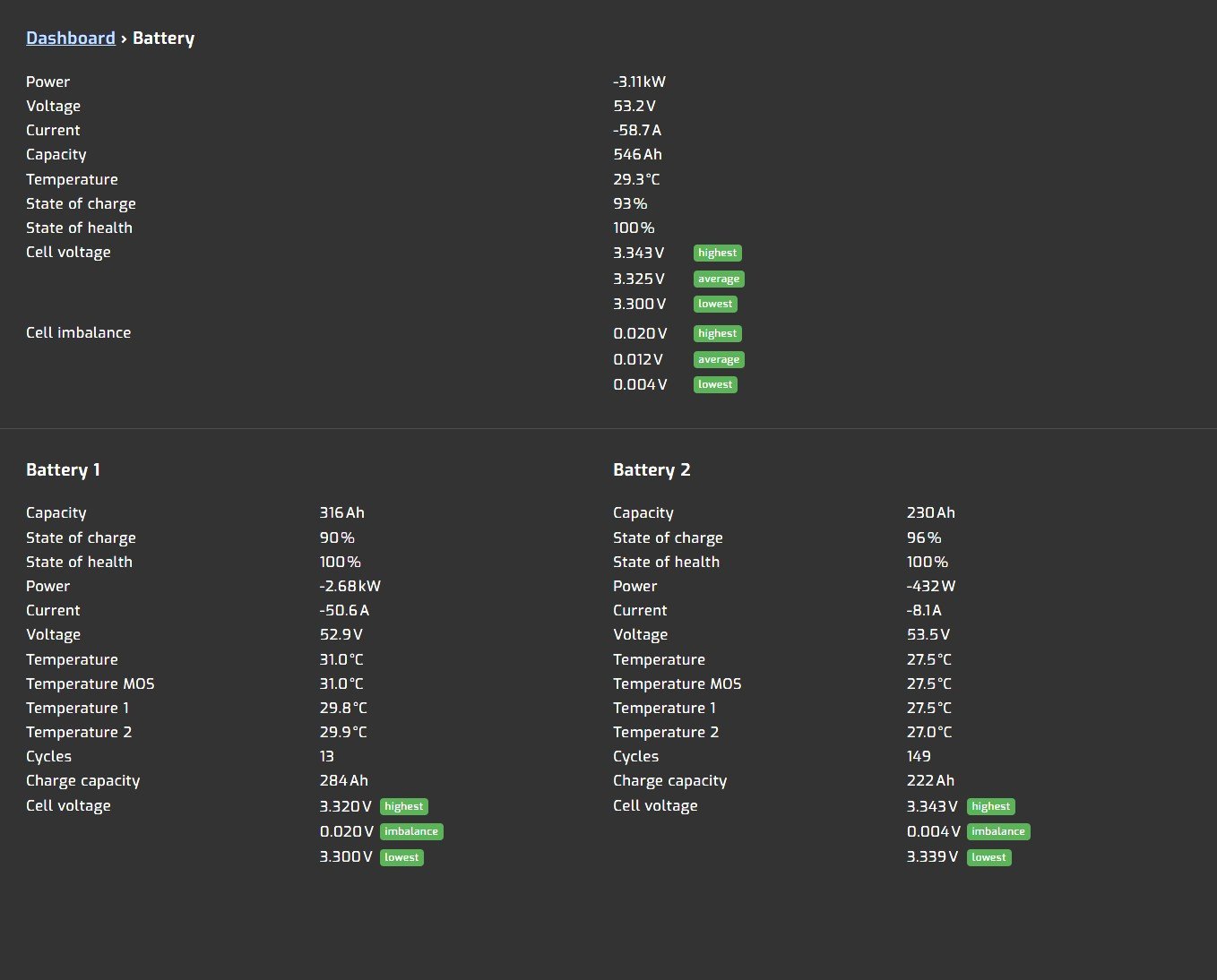 9,2kWp JV 45°, 4,6kWp JZ 45°, 2,3kWp JV 90°, 2 x Victron MP II 5kVA, 3 x SmartSolar 150/70, Smartshunt, Cerbo, 16x280Ah + 16X300Ah + 16x300Ah LiFePO4 + 3xJK BMS.