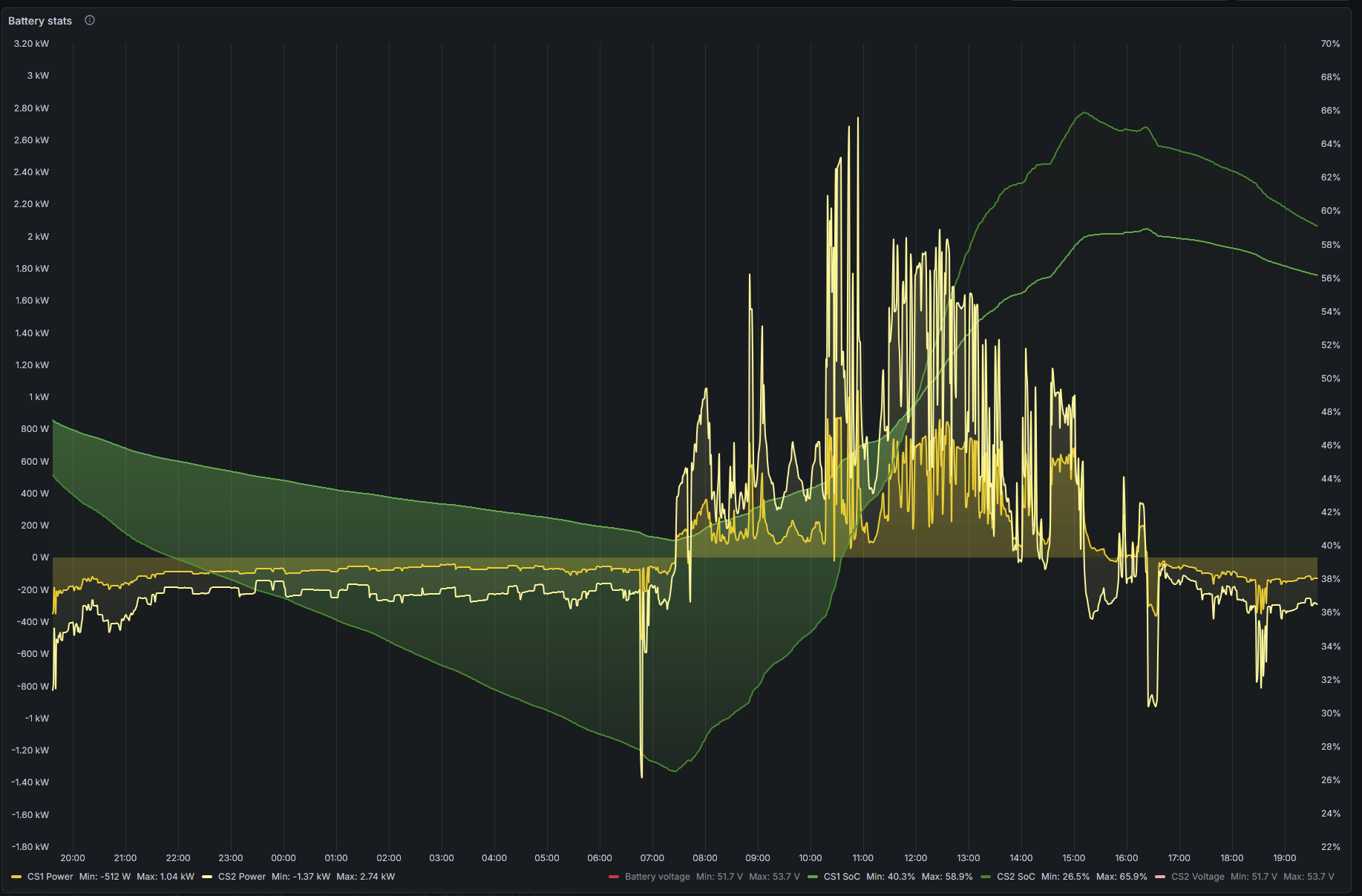 Ja prepínam na grid podľa SoC z CurrentShunt-u, pri 30%, napätie je vtedy (podľa záťaže rôzne) cca 51.2V . Ak by som potiahol z batérií 9 kW tak by som bol tiež niekde okolo 50V. Preto je prepínanie podľa napätia neoptimálne. Naposledy sem dávam graf SoC + Power z dvoch packov, 280 Ah 01/2023 a 315 Ah z 01/2025.