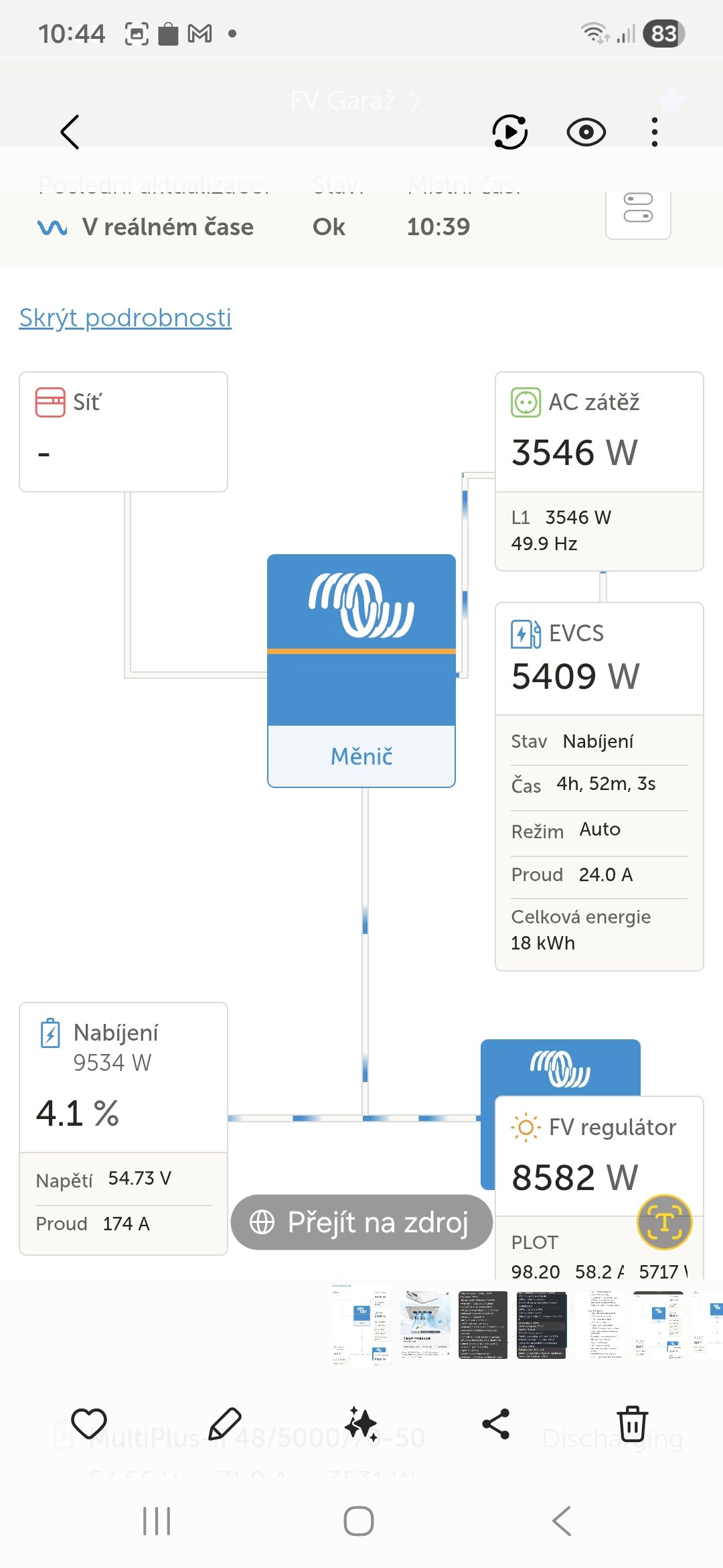 Jj tady vidíš jak to funguje k baterii v EV se systém chová jako druhé baterii v systému.Která má při nabíjení přednost.Použivám multiplus+ modráska.Proto je rozdíl ve výkonu AC a wallboxem.Max nabijeci proud mám 25A/230V