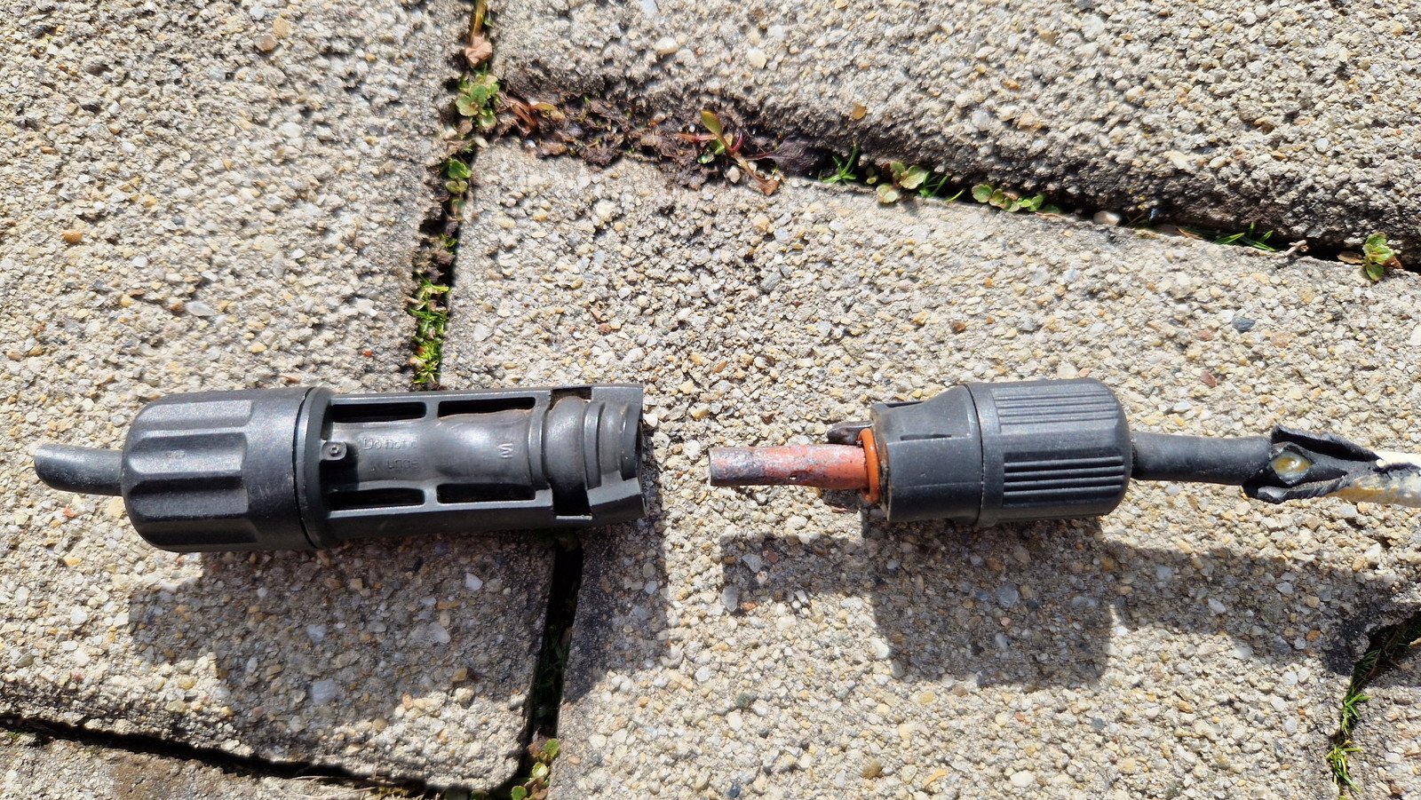 Druhý krok - rebrík na strechu. A čo som našiel! Roztavený spoj MC4, bol akurát medzi panelmi, takže do neho zrejme zatieklo. Veľké šťastie, že mám stringy s Voc 90V... Musím vymeniť kábel od kombiboxu na povale a dať ho o trochu dlhší, nech nie je spojený medzi panelmi.