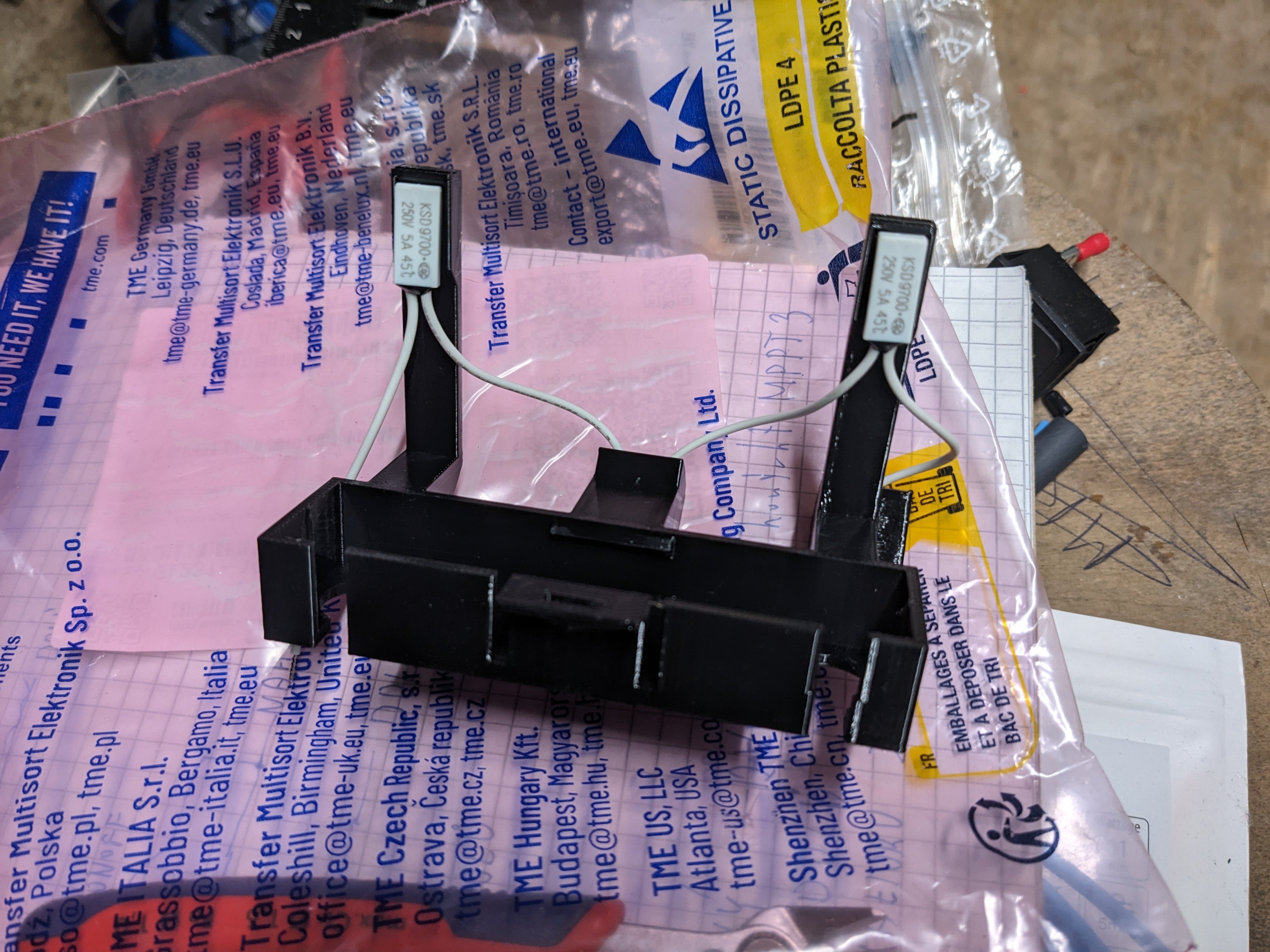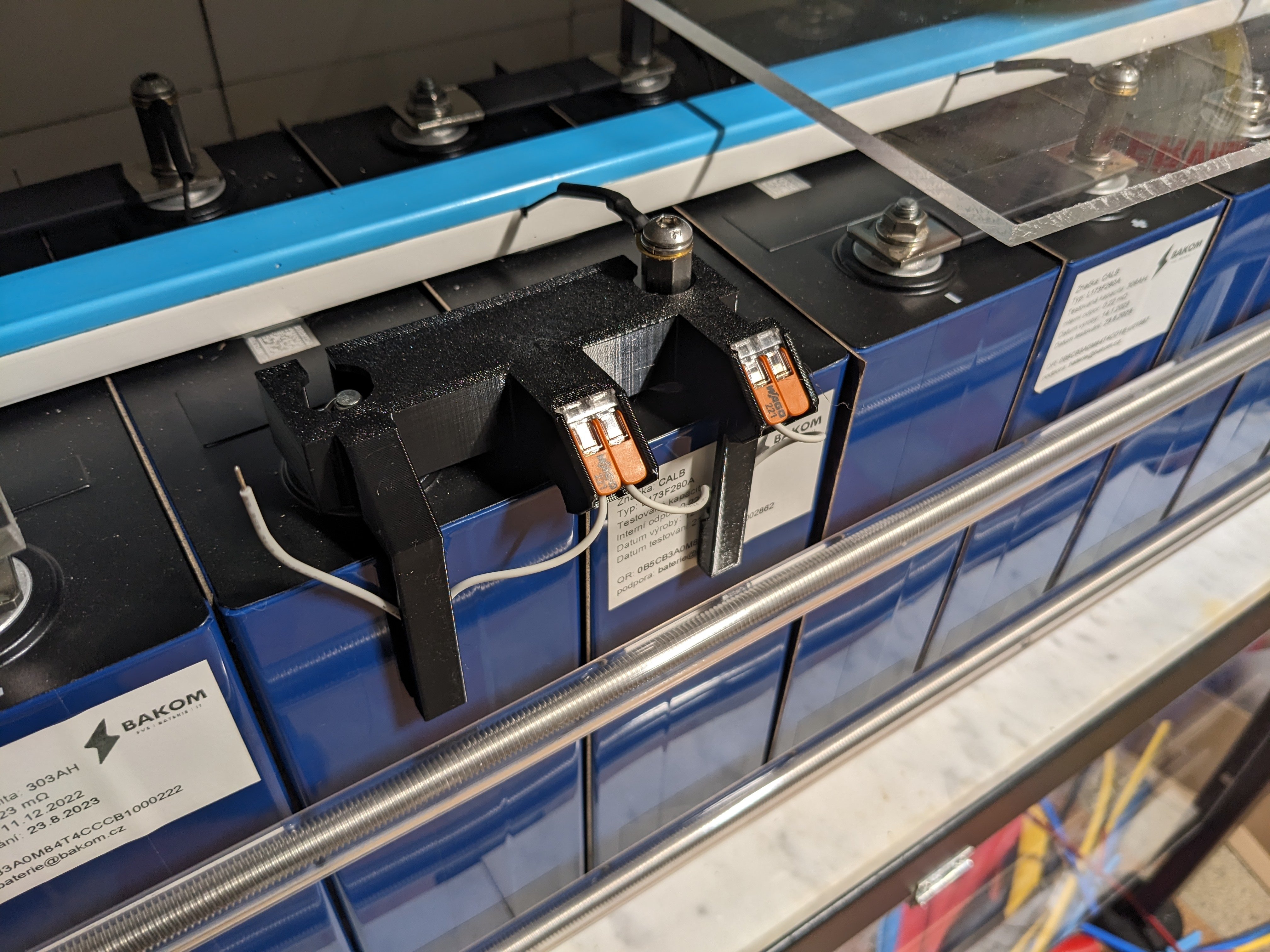 Začal jsem pracovat na detekci požáru akumulátorů, z Ali jsem objednal hrst rozpínacích termostatů 45°C a vymodeloval kryt terminálů, který zároveň bude držet termostaty na boku článků. Plánuji na každém článku 2, 32 ks spojených do série.
