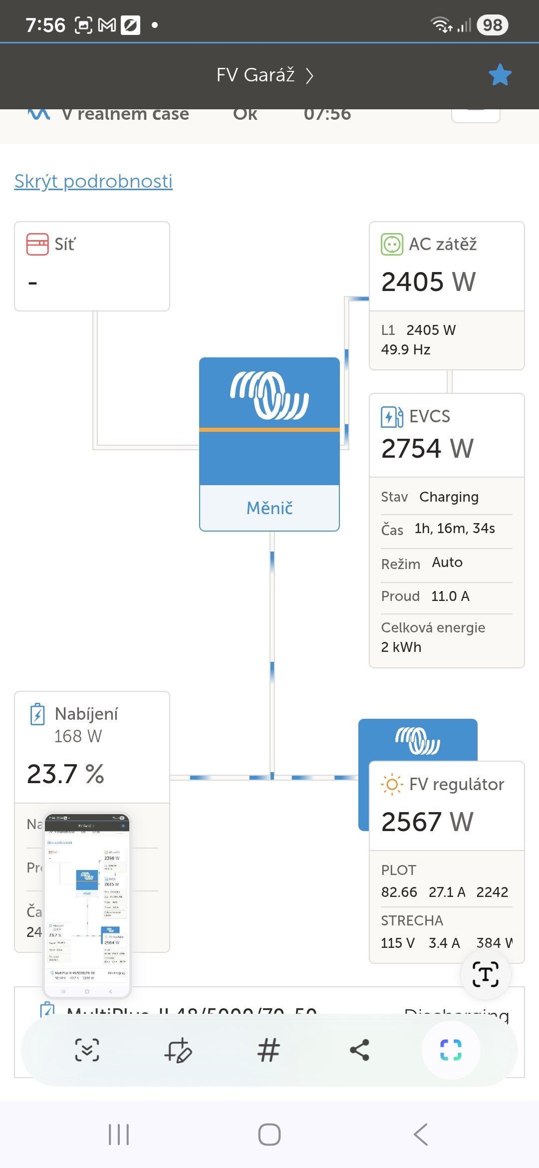 ostrov skoro 8kWp neustále ve stádiu zrodu: smartshunt(ex WBJR), MPPT150/45, MPPT 250/100(ex midnitesolar 150 clasic lite), 16S a různě P cca 340Ah Winston, MP II 5000,( ex Powerjack 8kW, ex samodomo cca 4kW). 48V DC rozvody a spotřebiče.