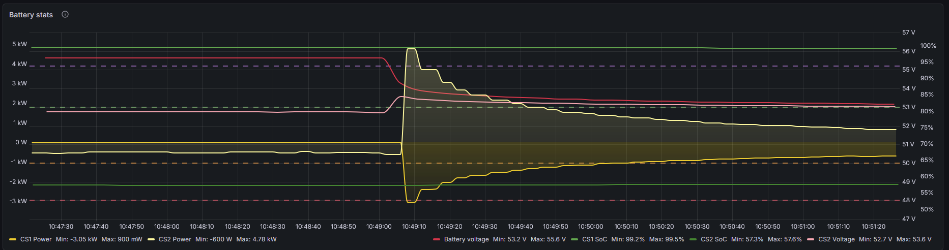 Ukážka spojenia dvoch LFP packov, jeden SoC 100% a druhý 57%. Po zapojení toho 100% išlo medzi batériami max 5 kW, po minúte to bol už iba 1 kW.