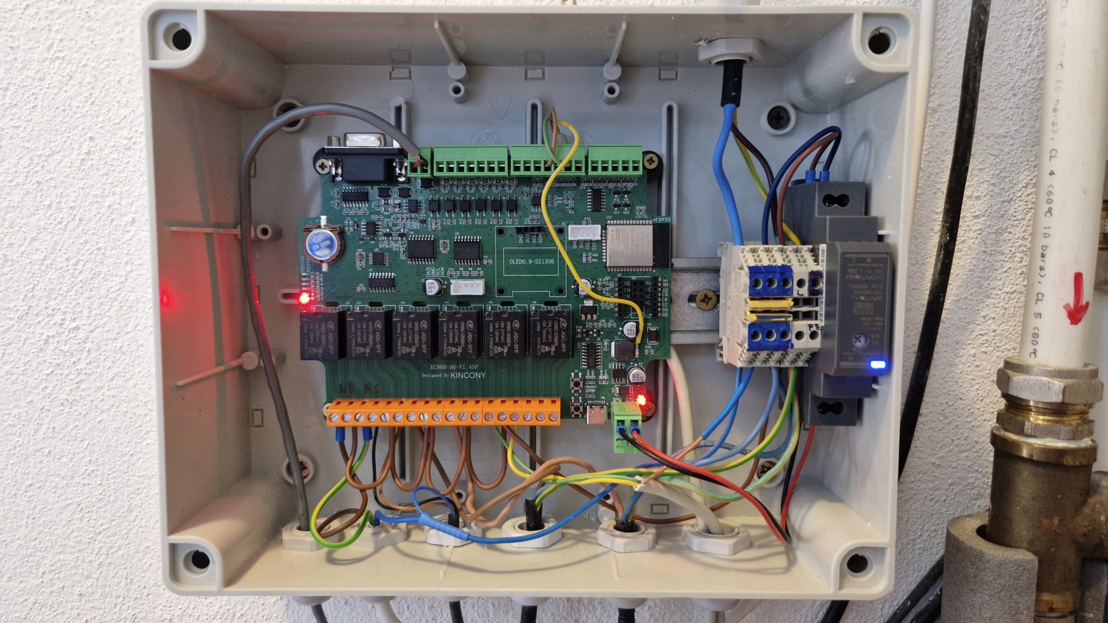 Ovládanie zapojené, odskúšané! Doska je Kincony KC868 A6, má jednu malú nevýhodu - nikde nemá vyvedené 5V, iba 3.3V (na konektore pre displej alebo na termináloch hore), tak som to musel naspájkovať napriamo. A ešte chýbajú popisky terminálov, ako bonus je zase možnosť (ako inak, ghetto way) doplniť ethernet rozhranie (Wiznet W5500) cez SPI rozhranie pre nRL24L01 a/alebo LoRa.
