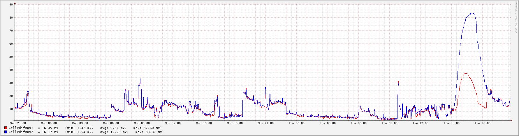 Těch 83mV, to se ukázalo rozbalancování baterky po zimě, když se přiblížila plnému nabití, jinak se to drží v rozumných mezích.
