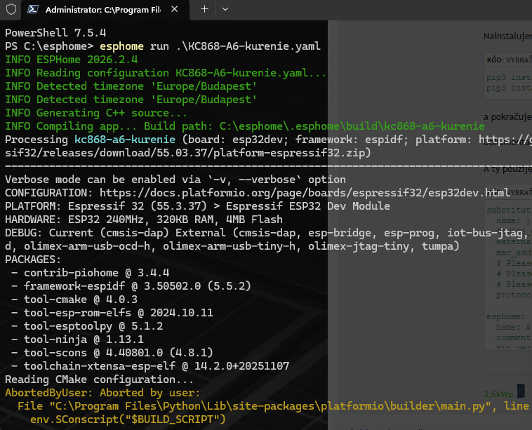 2. V esphome na počítači pak bude potřeba zkompilovat ten upravený *.yaml soubor a tím vznikne binární soubor *.bin a ten se pak nahraje do modulu ESP32 (buď přes usb nebo wifi).