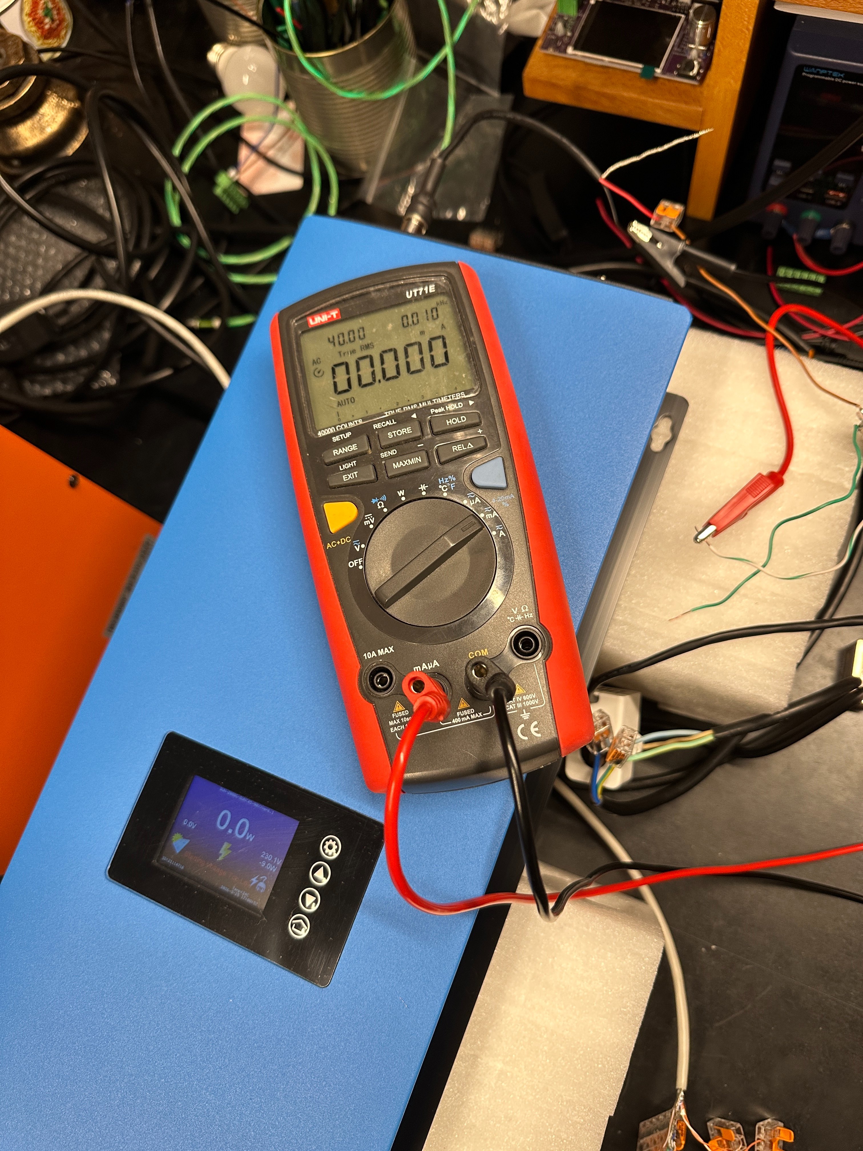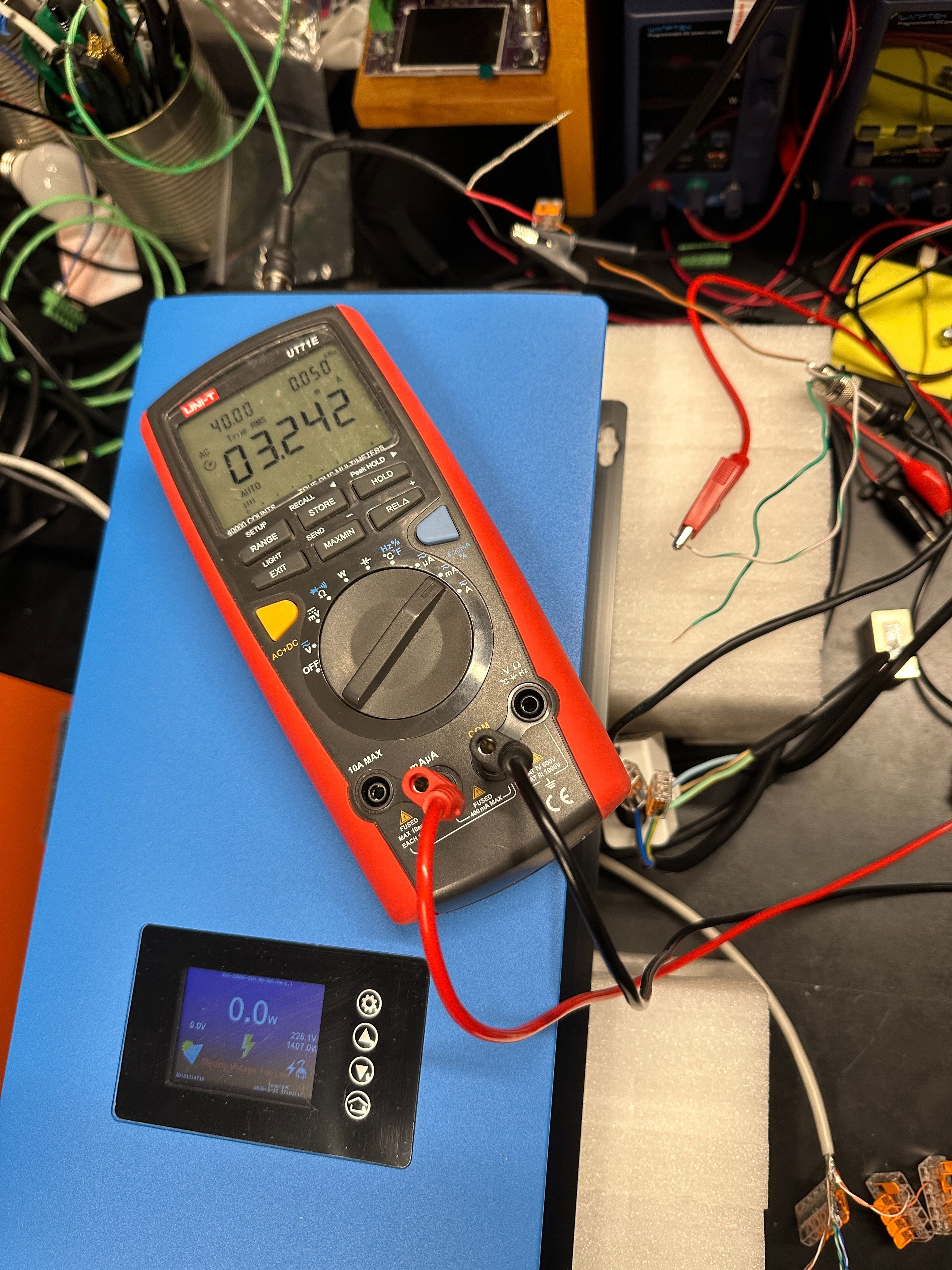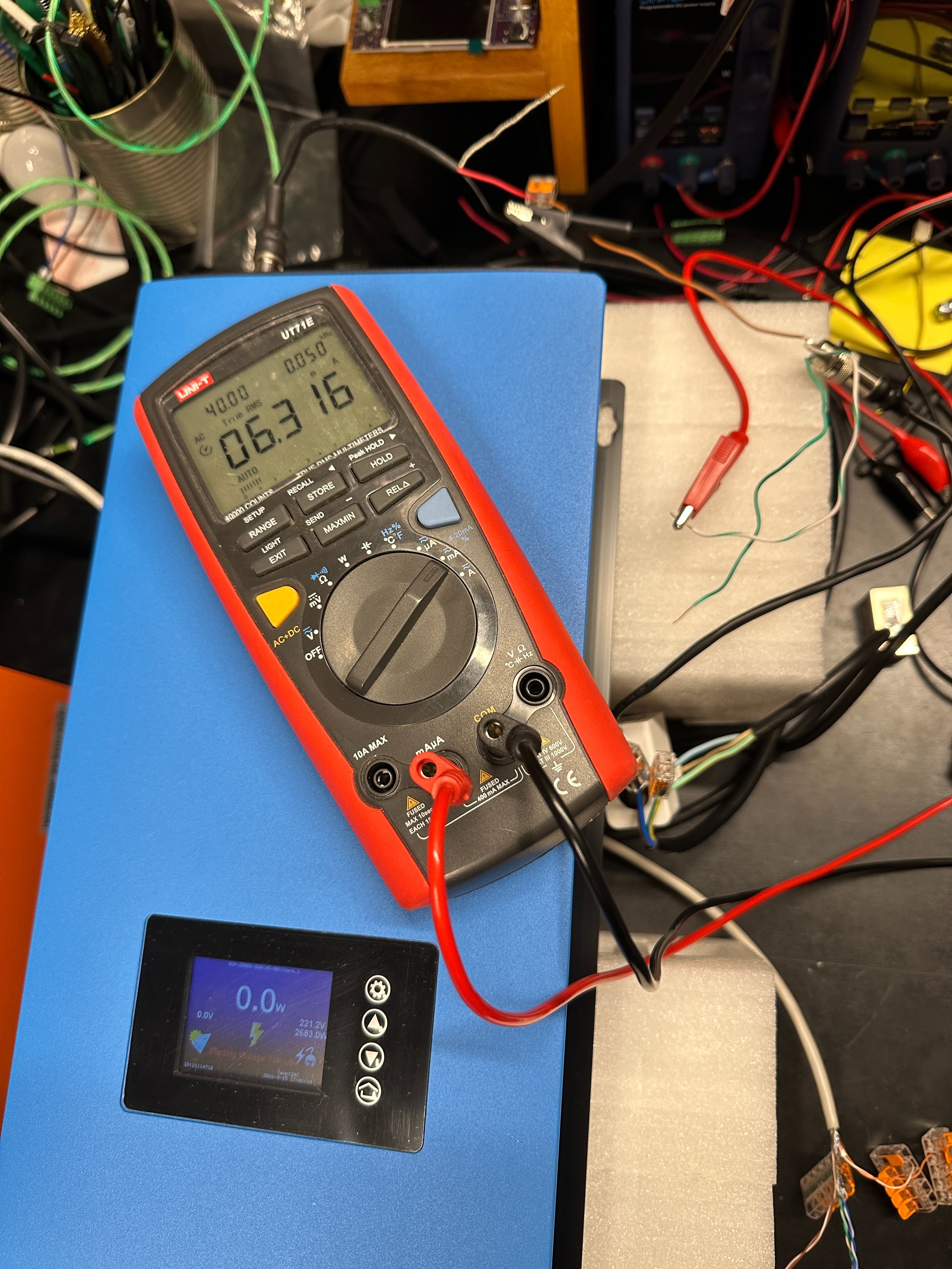 Pri pripojenom multimetri v rezime merania AC napatia mi ukazuje -10W pri nulovom odbere. Pri pripojenom ohrievaci na 1500W menic ukazuje 1422W a multimeter 164,5 mV. Pri pripojenom ohrievaci na 3000W menic ukazuje 2717W a multimeter 322,1 mV. Pri meranim prudu sa to sprava podobne. Pri pripojenom multimetri na meranie amperov a nulovom odbere menic ukazuje -9W. Multimeter 0A. Pri pripojenom ohrievaci na 1500W menic ukazuje 1407W a multimeter 3,242 mA. Pri pripojenom ohrievaci na 3000W menic ukazuje 2683W a multimeter 6,316 mA. Co by v podstate aj + - autobus sedelo. Na kazdy 1 amper odberu ktory snima CT pripada 0,5mA prudu generujuci CT. Pri nejakych 12-13A co odobera ohrievac pri 3000W nastaveni by to robilo nieco medzi 6 az 6,5 mA.