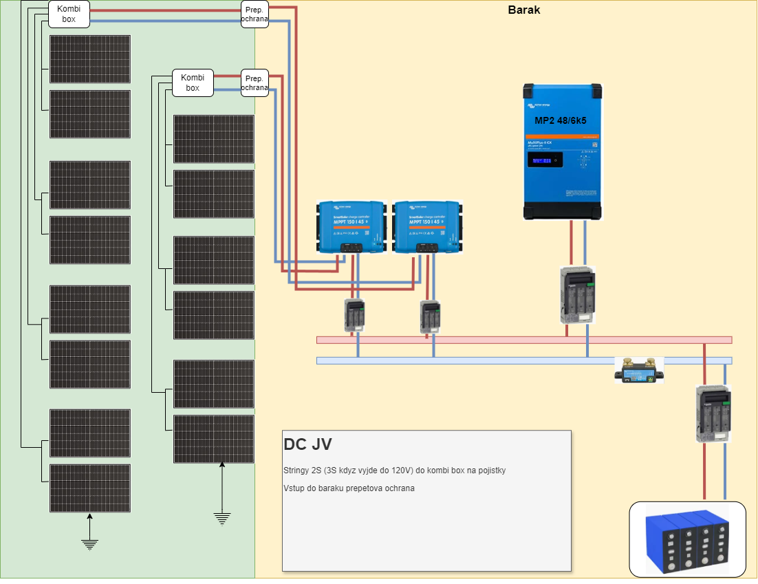 Mam nacrt ("schema") DC casti JV stringu. Zatim tam mam dva mppt, mozna by byl lepsi jeden? (rikal jsem si, ze kdyz se neco stane s jednim, pojede aspon pulka).