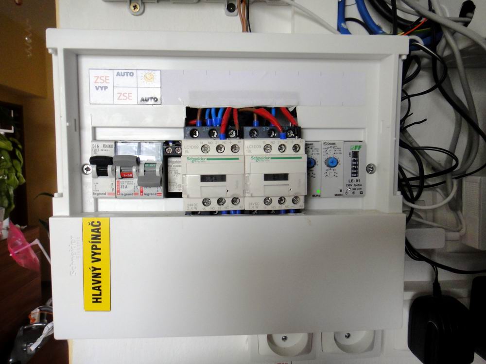 - Časovými relé nastaviteľné oneskorenie prepnutia stykačov (nechávam 5 sekúnd);