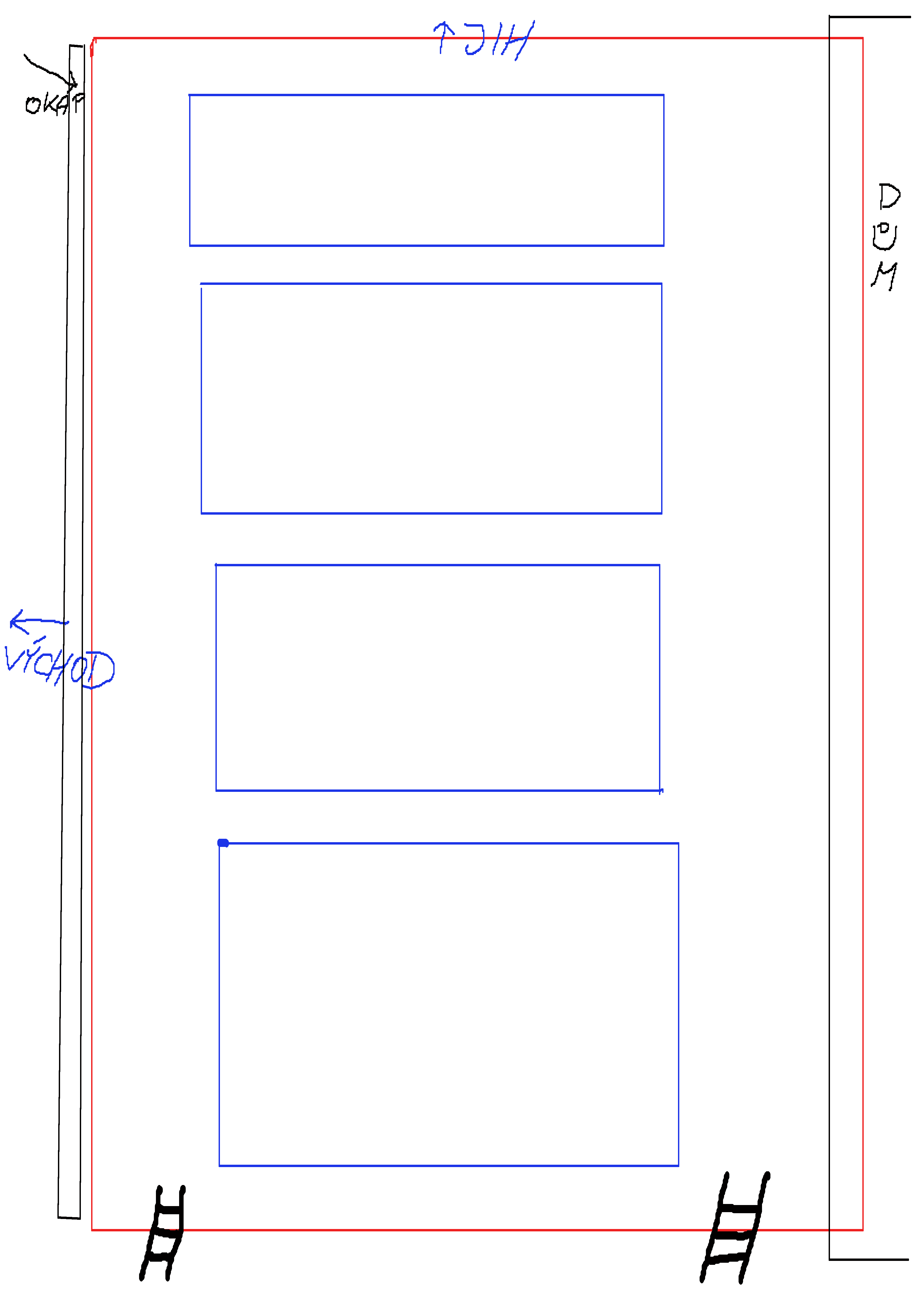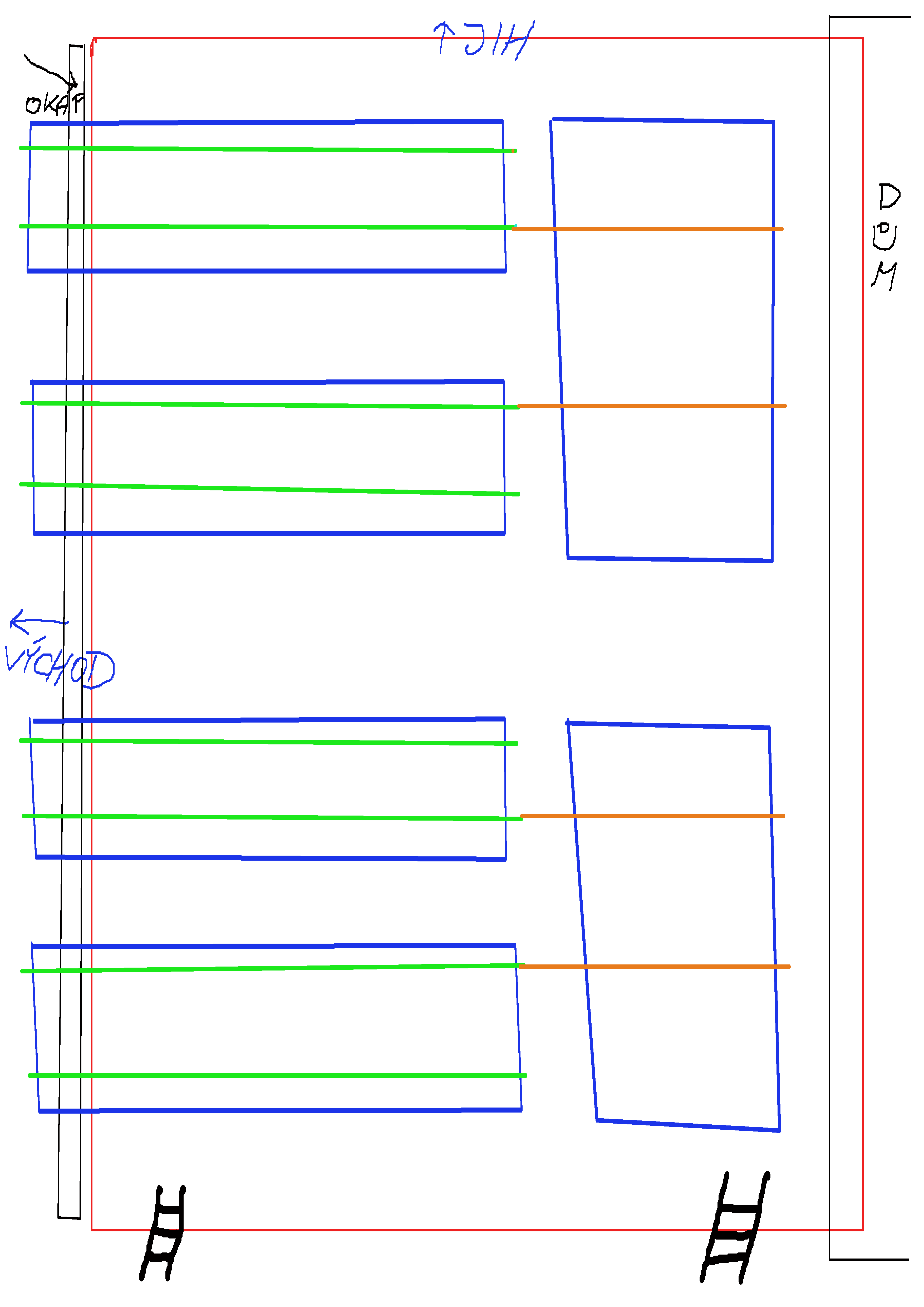 Možnost 3 - 6panelů. Ty dva pravé panely mohou být buď naplocho, nebo lehce přizvednuté k jihu, nebo být téměř svisle a být opřeny o můj dům. Opřeny o dům budou mít menší celkový zisk, než když budou naplocho. V obou případech bude zachován prostor kolem panelů. Čtyři panely ve sloupci umožní nějaké větší naklonění. Dopoledne a v zimě by ale stínily těm napravo. Bylo by potřeba to nějak odpozorovat a postupně upravovat.