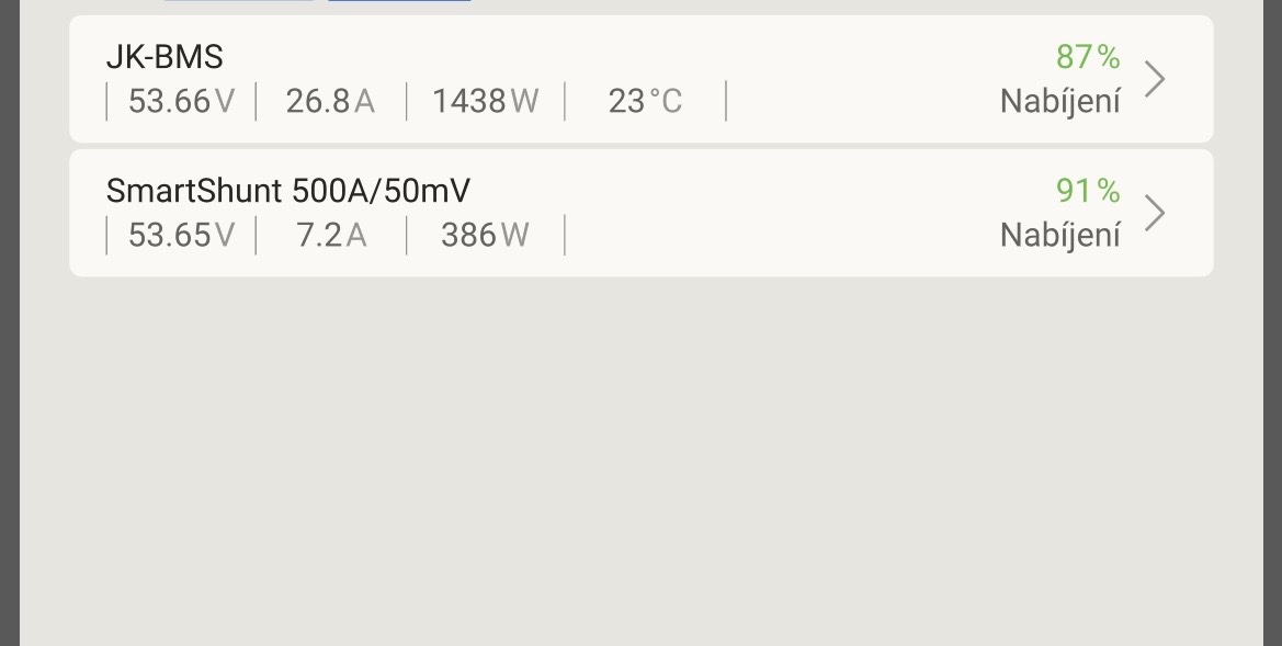 Dalsi divna vec je rozdil proudu JK BMS a SmartShunt pokud jenom vybiji tak proud sedi ale pokud zaroven nabiji a je odber tak to ukazuje nesmysl.