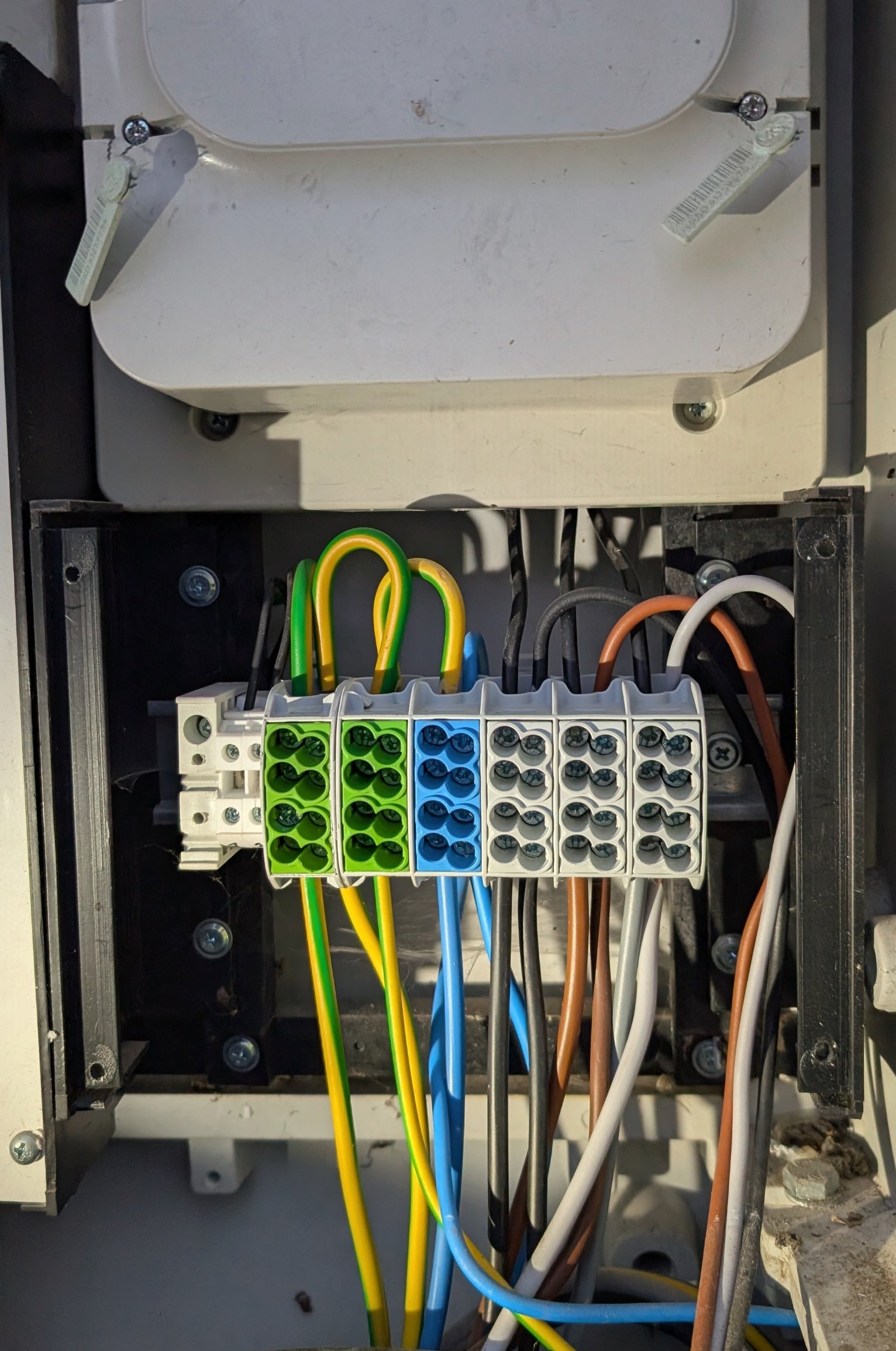 Povodne som si myslel, ze pomocou tejto pasoviny je spraveny v skrinke bod rozdelenia PEN na PE a N aaaale, dal som dole kryt a vidim tam takuto svorkovnicu: