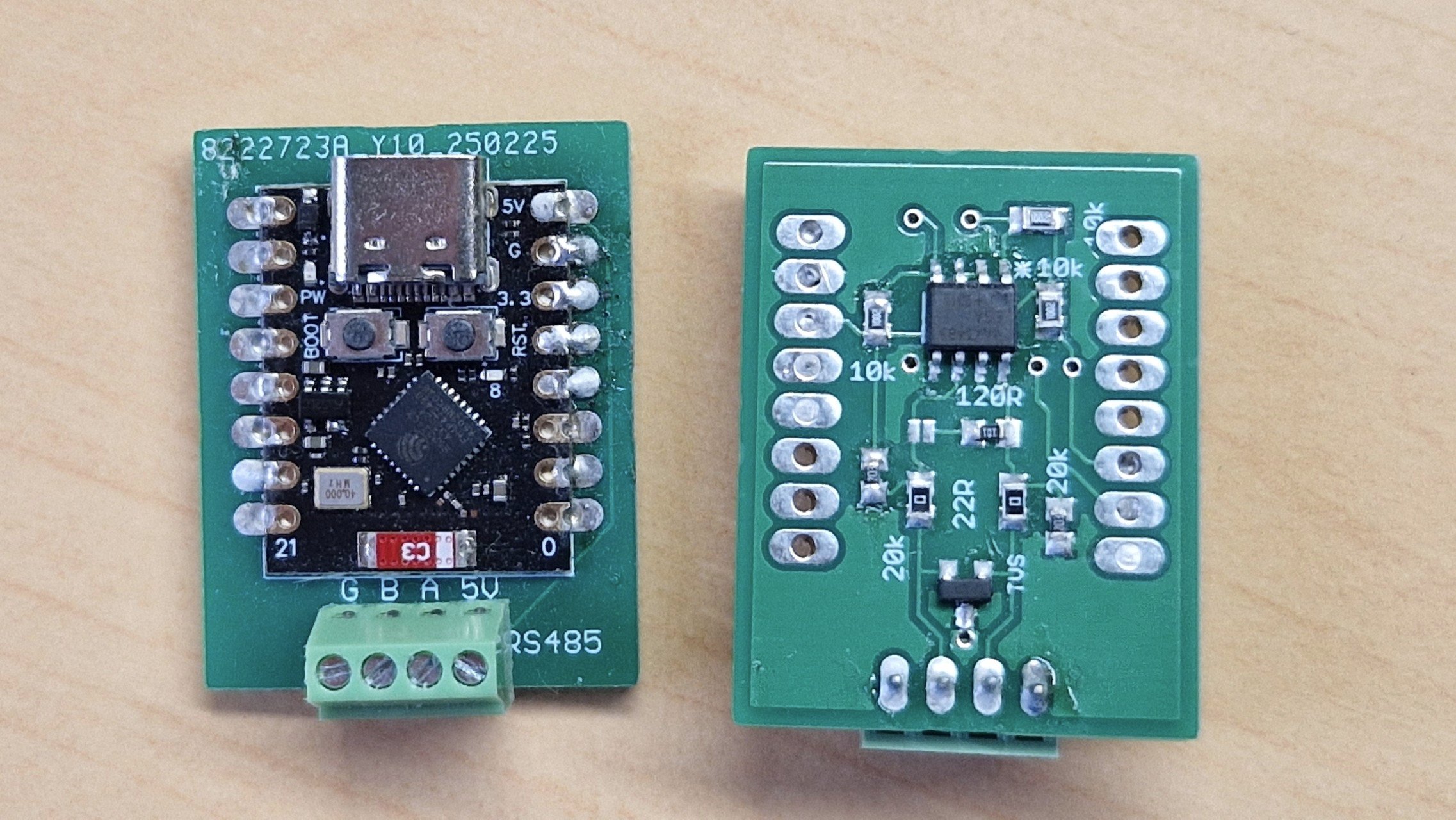 Miniatúrna doska s rozhraním RS485, firmware ľubovoľný, ja používam ESPhome. Vhodné pre situácie, kde potrebujete komunikovať s RS485 zariadením a následne cez WiFi ďalej (do Home assistant, MQTT...). Nie je tam ochranná dióda na napájaní, takže je možné napájať cez USB-C a na termináli bude 5V, alebo ak máte v zariadení kde je RS485 aj 5V, viete z toho napájať priamo modul. Je tam dostupných aj 10 GPIOs (ADC, SPI, I2C, UART...), takže viete ku tomu pripojiť aj čokoľvek iné - OLED displej, Dallas čidlá, fantázii sa medze nekladú