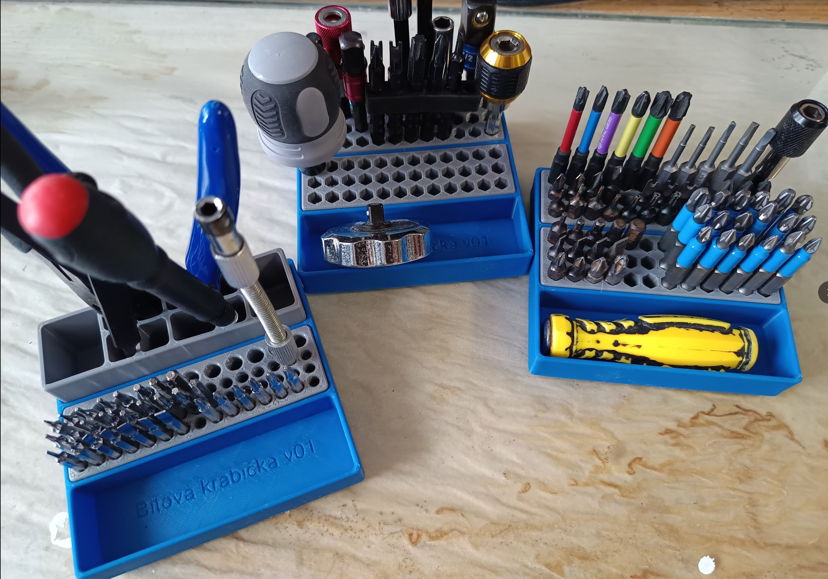 Jen tak zkušenost pro nás začátečníky. Různé držáky/zásobníky na bity a podobné věci je lepší dělat z něčeho pružného (TPU), bity po tom nekloužou, nevysypou se při překlopení a nerachotí. A i když jsou třeba bity 6 stranné, tak u takového TPU se klidně dají udělat kruhové otvory (tady to mám pro bity 4mm, pro 6mm mám šestihranné), ve kterých drží stejně dobře. Vlastní "obal" pak z něčeho tuhého (tady ABS).