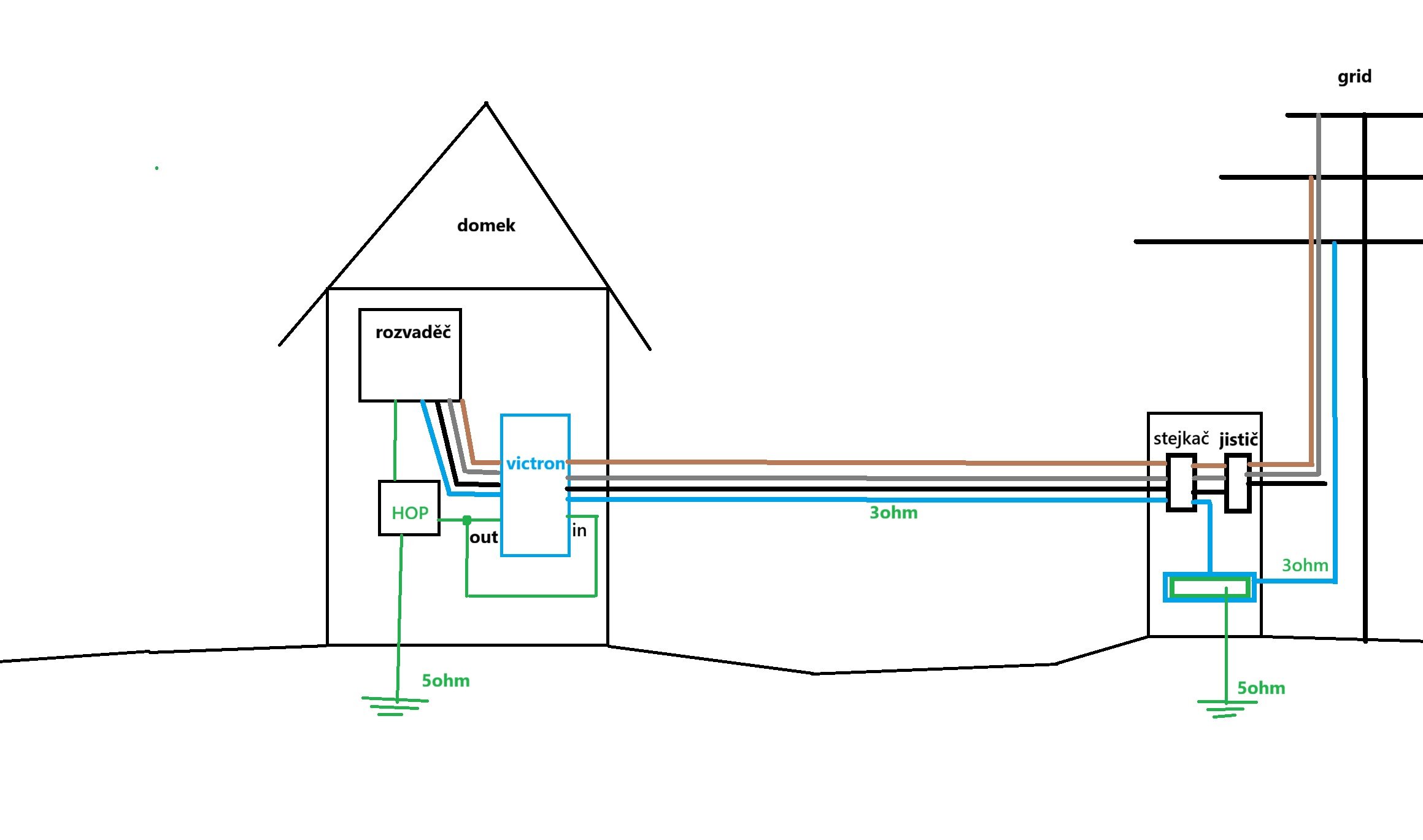Jaká je vzdálenost viz. obrázek, mezi přípojným místem a rozváděčem? A jaký kabel je použit. Jak vypadají zemnící tyče, rozměr, typ,přidaný aditivní zemitý obal okolo ní pro zlepšení odporu, jak vypadá zemina do které instalován, kontaktní délka a hlavně povrch mezi kovem a zeminou, stáří a jaký kov případně pokovení. Také vzdálenost od objektů aby nebyly tyče v suchu.lemra79 píše: pát dub 03, 2026 8:21 amS tou imtedanci u ostrovniho menice to bude slozitejsi. Vychazim z toho, ze meridlo zatizi L proti PE a meri ubytek napeti, z toho vyjde impedancni smyčka.