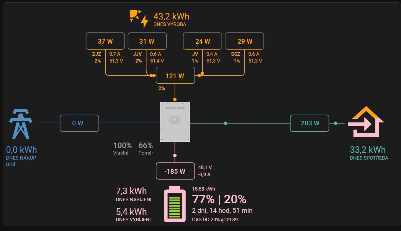 SkyFVE 8 kWp na výzkumné "chytré" chatě. 4x MPPT Epever XTRA4415N 4x40A, 3x LG Chem Li-Ion 12s 156Ah (cca 20 kWh/44V), SkyPowerBox LF 4810 1kVA, Victron MP 48/3000, REVO VM II 5.5kW , APC SmartUPS 5000 + PLC Siemens Logo! + Dell Optiplex 3040 Micro (Proxmox: HA, Node-RED, InfluxDB, Grafana, Mqtt, Zigbee2Mqtt, Samba, Tailscale)