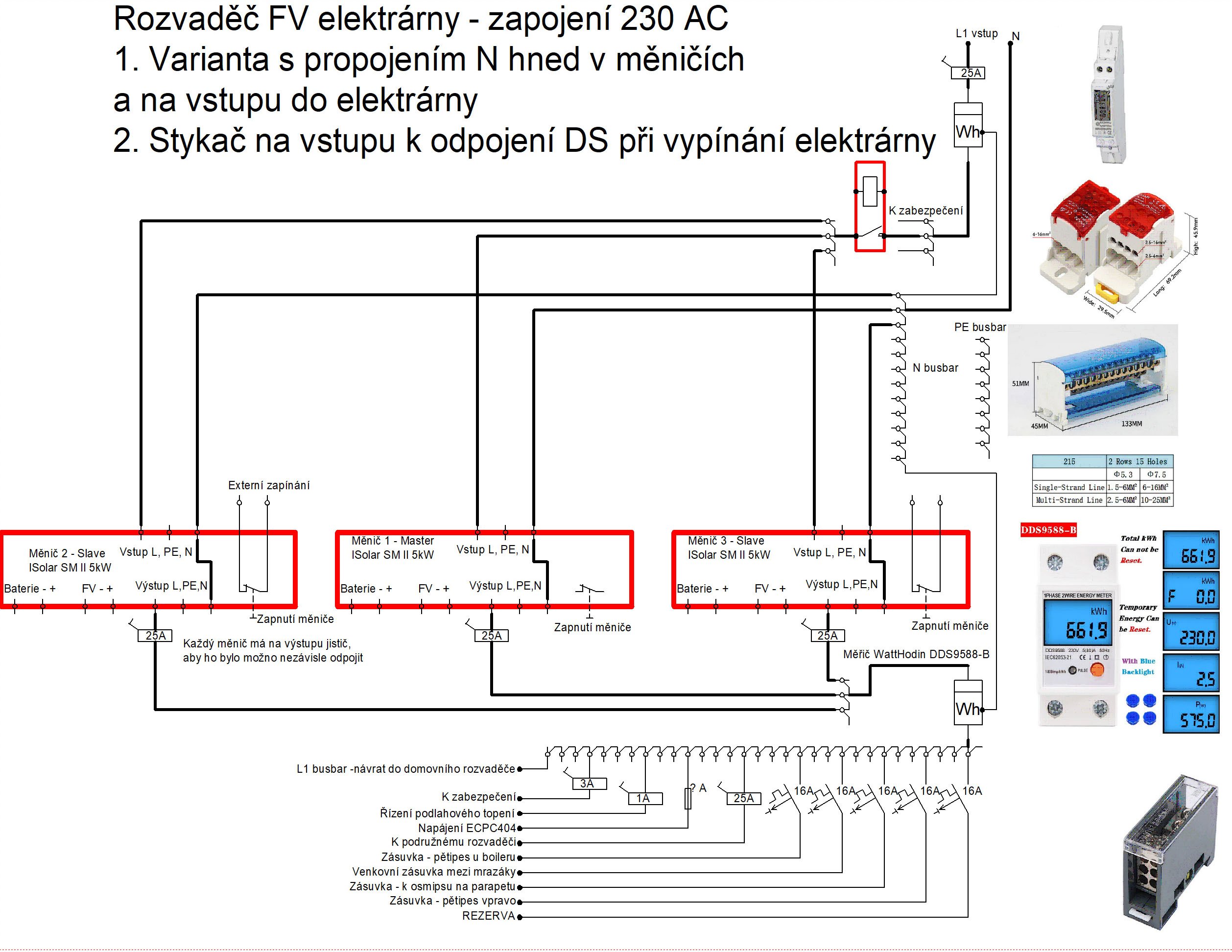 Ja budem mat tiez vsetky chranice az na vystupe menica. Skusim urobit schemu ako to chcem, lebo tazsie sa to vysvetlujerva píše: sob dub 04, 2026 6:48 pmMé kombiměniče mám zapojené takto. Chrániče jsou až na výstupu měniče. Bod rozdělení je u hodin, od kterých vedu L+N+PE bez chrániče jen přes jistič na fázi. Od hodin k měniči mi tak stačí 4 vodiče: L1 vstup, L1 výstup, N, PE. Schema odpovídá, i když tam jsou už jiné komponenty, integrovatelné do Home Assistant a "klasické" elektroměry jsou pryč.