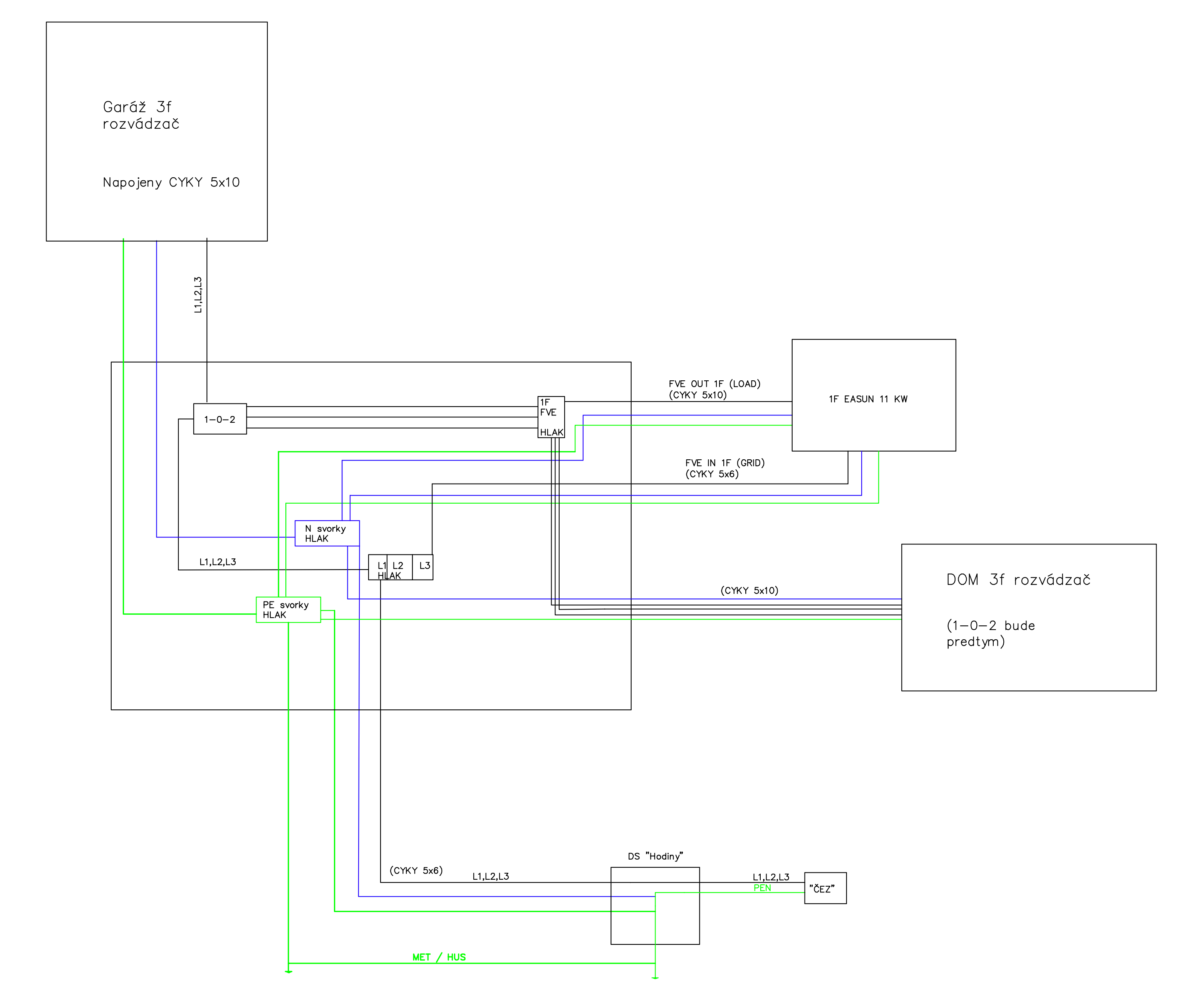 Nakreslil som, ako som povodne planoval AC vystup FVE a pripojenie GARAZE (resp DOMu). Skuste sa prosim na to pozriet (ci to dava logiku) a ak by bol niekto taky dobry, skuste mi tam nakreslit, ako by som mal z toho pripojit EASUN, aby bol zachovany len jeden bod rozdelenia.