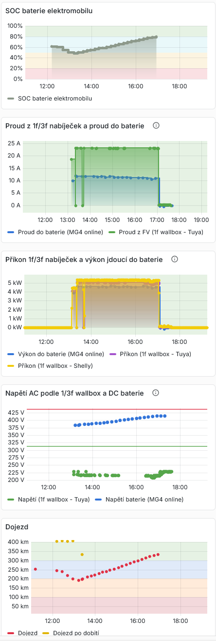 MG4 dobíjím z 1f a zatím jsem na 25A s tím, že by mělo jít až 32A. Přes obyčejnou čínskou nabíječku s tuya, kterou mám integrovanou do Home Assistant. Sleduji i proud do baterie a napětí baterie, jak hlásí auto, které mám rovněž integrované do HA. Podle typu článků vím, kde se má napětí baterie pohybovat - to jsou ty vyznačené meze.gold1 píše: stř úno 25, 2026 8:15 pmTrochu jsem se ponoril do udaju jednotlivych znacek a jsem z toho docela zmateny.Napr.koncernova auta(Skoda,VW)maji pouze 11kw AC nabijeni a vice jak 16A po jedne fazi udajne nepusti.Takze nejake smysluplne vytezovani behem odpoledne je jen mokry sen.U BMW to urcite ma takto iX3 a u iX1 je udajne nutne priplatit za 22kw nabijecku a jestli to zvladne auto s 11kw nabijenim nikdo nevi.AI mele nejake nesmysly o tom,ze nejaka auta v pripade nastaveni 1F nabijeni propoji fyzicky 2 faze a tim docili tech 32A,ale nepodlozi to zadnym manualem ani oficialni zpravou.Muze zde napsat realnou zkusenost nekdo,kdo ma takove auto a nabiji ho pres wallbox pouze z 1 faze???