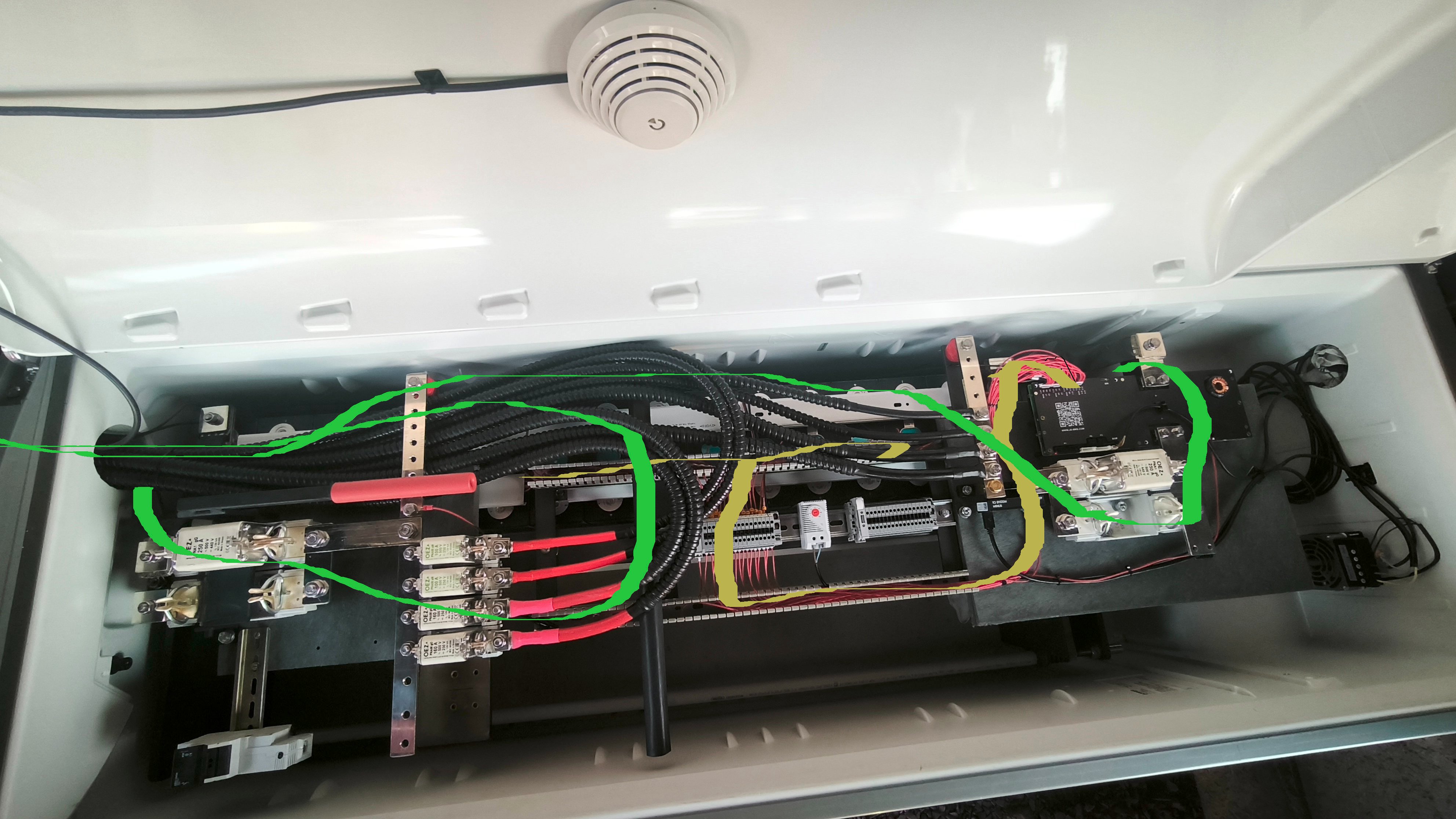 to je přesně ono. Na obrázku jsem namaloval směr proudu a vodiče silové zeleně a bms žlutě. Na první pohled je vidět závit na + polu baterie. Pokud není zapnuté balancování, tak daný vstup BMS je na poměrně vysoké impedanci, a stačí fakt málo, aby se tam nějaký napětí naindukovalo. Předpokládám, že vyšší "rozhoz" mají články blíž k + polu baterky. A tť kouske teorie. pokud to zvlnění z multiplusu bude cca 10A, proud teče jedním závitem, tak na 0,2 závitu zakončeném 100r odporem to teoreticky vybudí napětí 10*0.2*100=200V. To je teorie při dokonalé magnetické vazbě s železným jádrem. tady bud ekoeficient vazby tak 0.01 ne li míň. Doporučení: "narovnat " ty vývody + polu, tj z baterky na pojistku směrem doleva a dál vlevo ty další pojistky. + a - co nejblíž u sebe kvůli ploše smyčky. kus plechu mezi ty silový dráty a drátky od BMS jako magnetický stínění. schválně si to srovnej s origo boxwm od číňana:
