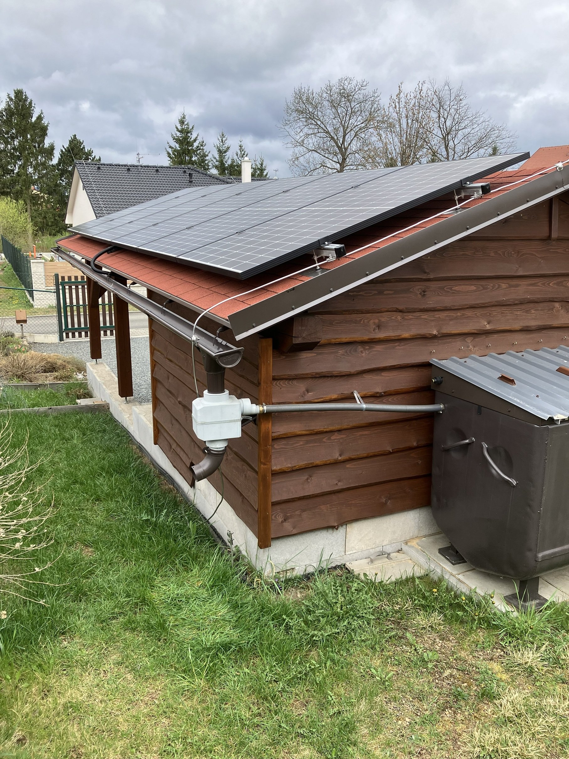 Slovutní páni solárníci, s dovolením bych oživil toto téma "kam s nimi", tedy s baterkou, reglerem a měničem. V případě mého systému nemám jinou možnost, než umístění do kouta přístřešku pro auto, který je jaksi z principu nevytápěný, leč skýtá alespoň ochranu před deštěm, sluncem a tlumí výkyvy teplot, neb podezdívka ze ztraceného bednění je částečně zapuštěna ve svahu. V rohu podezdívky jsou na zdi cetrisové desky jako montážní deska pro lehčí komponenty (měnič bude pochopitelně kotven až do zdi), viz fotka aktuálního stavu s již umístěným reglerem a DC rozvaděčem: Další podstatné komponenty jsou pouze zhruba naznačeny - modře měnič (Multiplus II GX 48V/3kVA), červeně pojistky (NH-odpínač baterku + mega pro regler), žlutě zemnicí svorkovnice. V levé části fotky je vidět zásuvka 400V/16A, ta přijde přemístit pryč a část stávajícího AC rozvaděče DS, který bude nový, o 4 pozice větší a bude obsahovat nově i AC jistění měniče. AC rozvaděč zůstane přibližně na svém místě. Pro představu ještě jedna fotka téhož rohu stavby zvenku: Tolik popis a nyní dotazy: