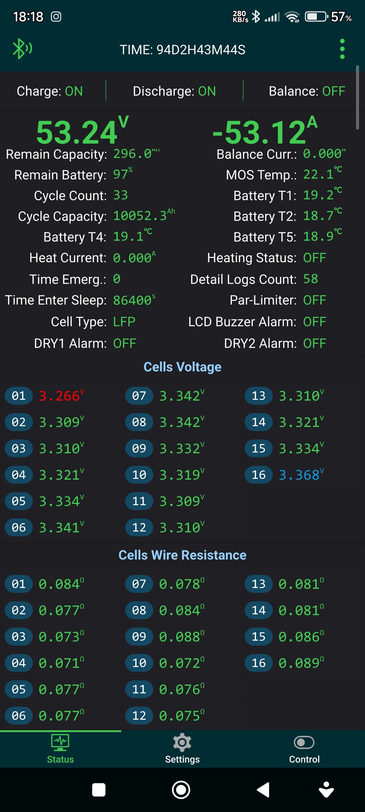 Toto jsou hodnoty z prvního spuštění BMS hodnoty odporu jsou stále stejné