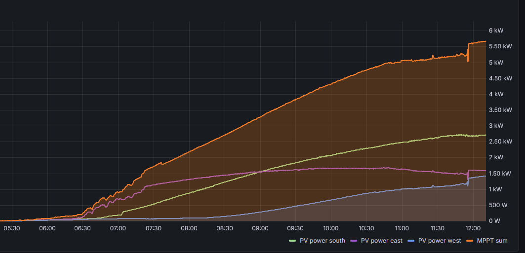 Aj v takýto slnečný deň môže pomôcť výrobe reštart MPPT na ktorý sú paralelne zapojené stringy východ a západ.