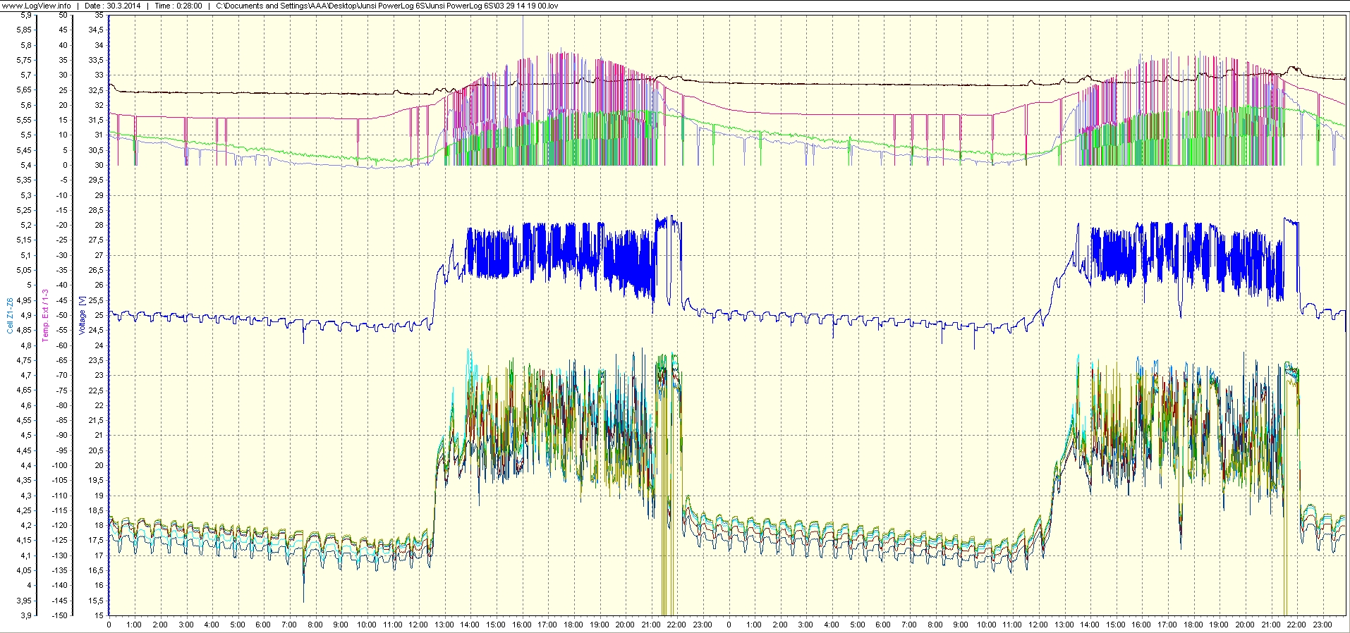 Užitočné je detailné zobrazenie napätí na článkoch – pripájam detail, v ktorom vidieť vplyv aktuálne urobených jemných korekcí nastavenia napätí na balancéri počas absorpcie. Napätie na jednom článku je tiež trochu rušené – viď text vyššie. Je možné zobraziť aj prúd, tečúci loggerom, pripojeným sériovo k batériam. Vtedy však dochádza k ohrievaniu malého tela loggera a nie je rozumné trvalo ho zaťažovať prúdom rádovo v desiatkach A. Preto meranie prúdu a zároveň kapacity a výkonu trvalo nepoužívam, hoci je to možné. Logger je pôvodne určený na časovo ohraničené testovanie elektrických pohonov modelov a nie na nonstop prevádzku v solárnom systéme. Nie je dôvod, aby neposlúžil aj nám.