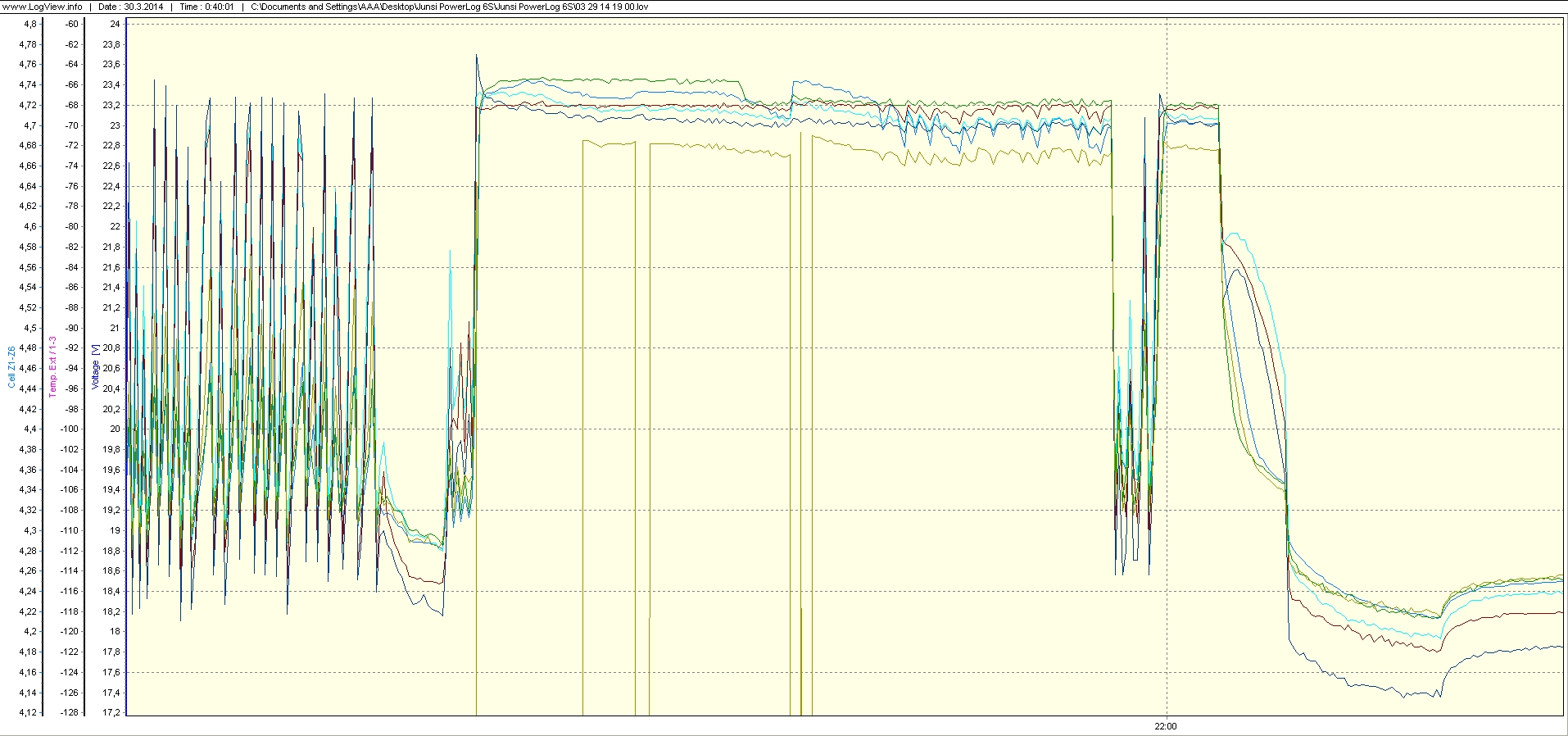 6 farebných kriviek =napätie na článkoch Tzv. externé teploty sú zarušené pri zvýšenom výkone meniča a ruchmi od stykačov. Analýzu ešte urobím a skúsim zatieniť vodiče. Akákoľvek skúsenosť s digitálnymi čidlami Dallas je vítaná. Možno je na vine aj veľká dĺžka signálnych vodičov – trojlinky ( cca max 10 metrov ! ).