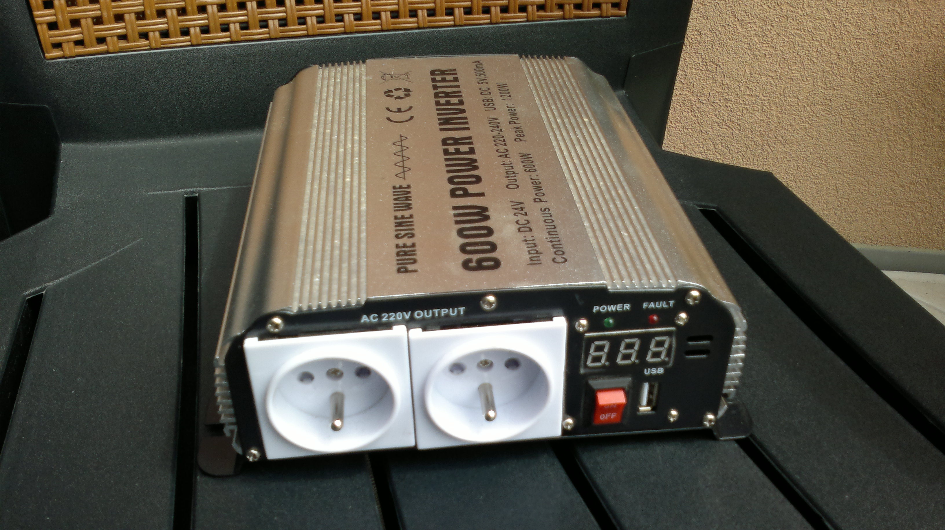 Nabízím k prodeji nevyužitý měnič napětí 24V na 230V s výkonem 600W/1200W a čistým sinusovým průběhem. Měnič bez problémů napájel lednici A+, televizi, počítače a hi-fi zařízení. Důvodem prodeje je vlastnictví dalšího silnějšího měniče. Původní cena byla 3990 Kč, nyní nabízím za 2000 Kč s možností menší slevy při rychlém jednání. Záruka platná do 19.8.2015.