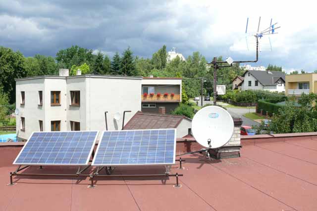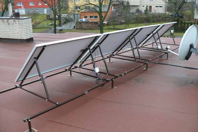 Ke konstrukci na střeše bych ještě dodal, že sklon panelů je nastavitelný na úhly 30°, 36°, 42° a 48°, orientace na jih. Teď v zimě jsou na 48°. Systém bych chtěl rozšířit ještě o dva panely na celkových 1200Wp. Panely by tak byly pěkně v jedné řadě. Samozřejmě bude potřeba přidat i akumulátory