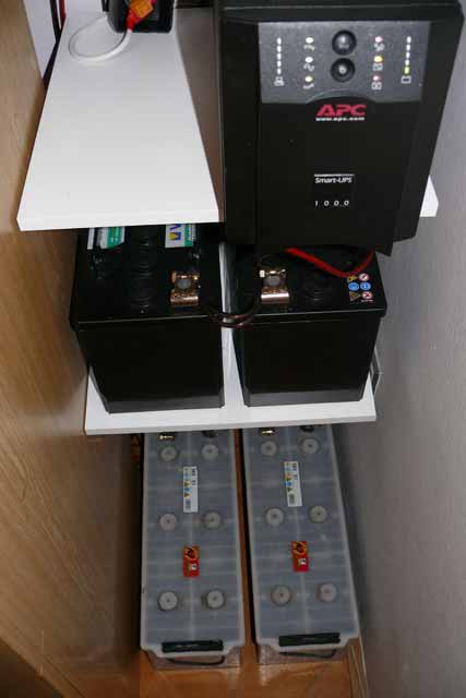 BAT jsou 2ks gelových akumulátorů 5Ah, které jsou přímo v UPS. Jsou tam pro vyrovnávání špiček při zapínání spotřebičů. 24V do UPS totiž neberu přímo z akumulátorů, jak je běžné, ale z výstupu regulátoru, abych měl přehled nejen o vyrobené energii, ale také o spotřebované.