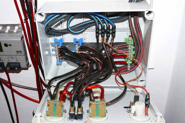 Kabely: 4mm2 od FV panelů do rozvaděče, 6mm2 z rozvaděče k regulátorům, k akumulátorům a k měniči.
