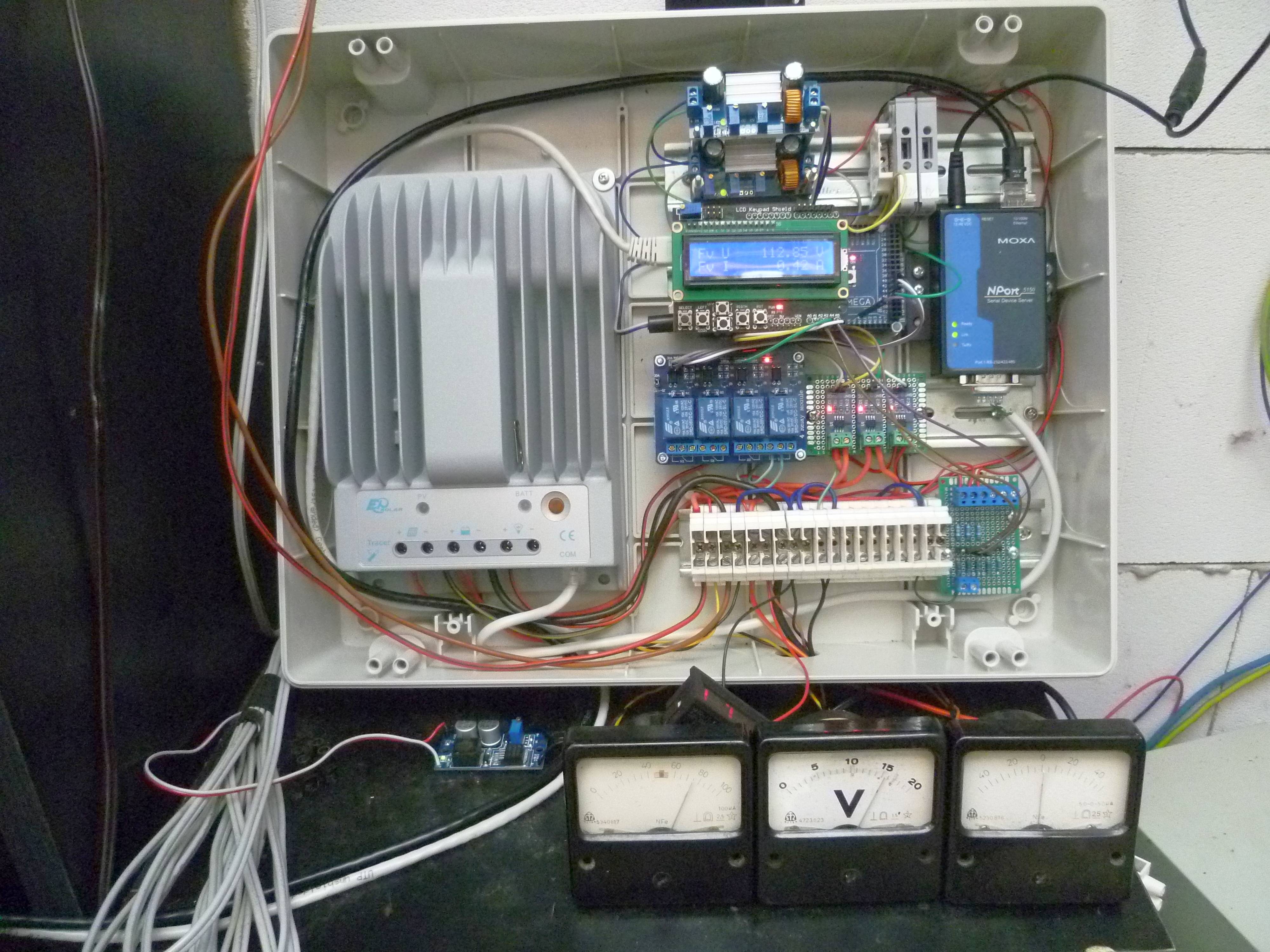 Dekuji, zatim je to takovy vyvojovy prototyp, potreboval bych jeste dodat DC/DC menic na 24V, trochu upravit a zkultivovat svorkovnici. Nasledne merici moduly proudu me ponekud zklamaly svoji presnosti a stabilitou, rad bych tedy dodelal do Micrologu moznost odectu těchto hodnot z regulatoru (meri napeti a proudy vsech terminalu) pres RS485 rozhrani s pripadnym logovanim a zpristupnenim z webu. A az to bude takove odladene po funkcni strance, tak ucesat a vnitrni rozvody toho rozvadecku.