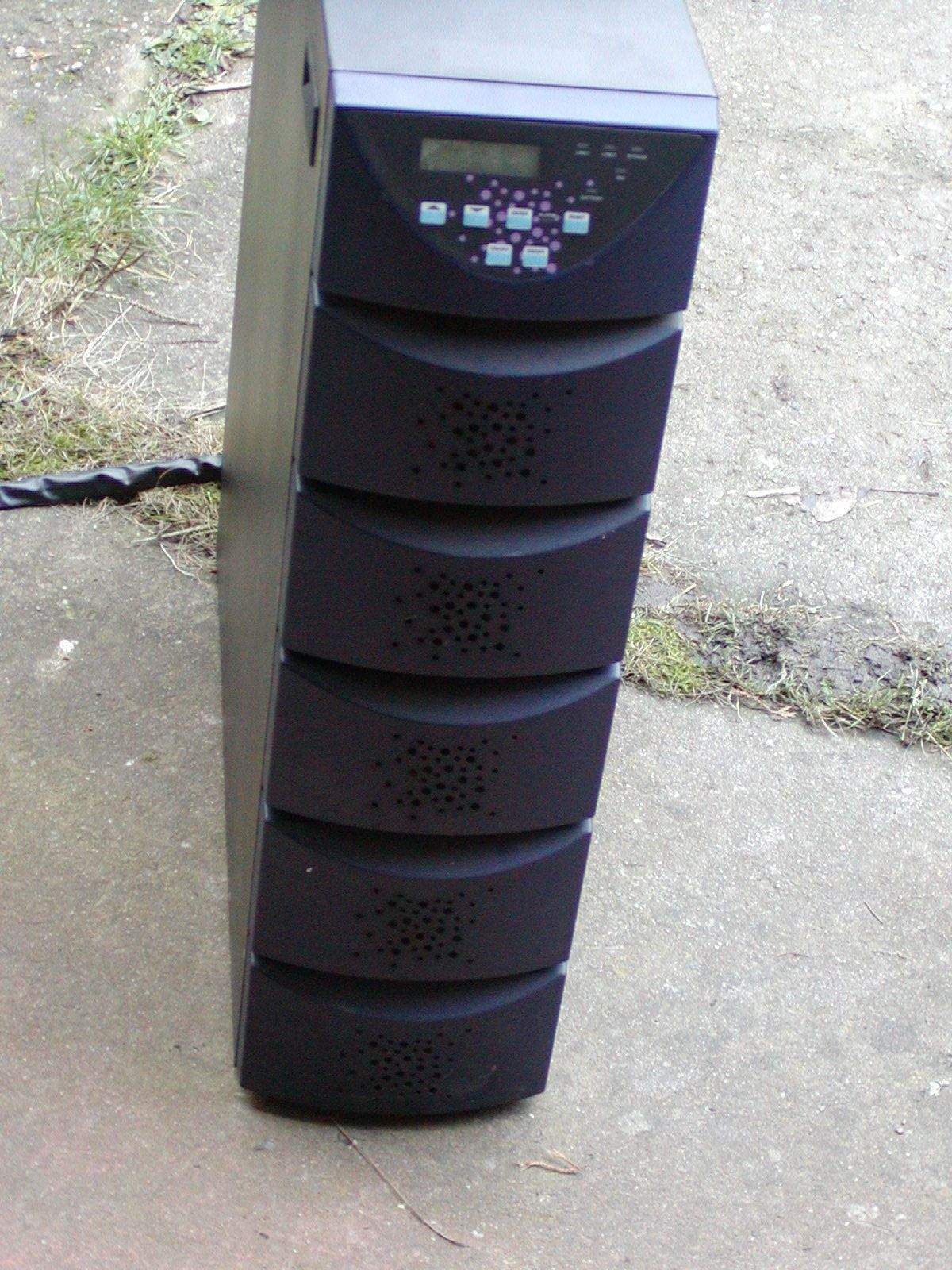 Velká UPS 7kW 10kVA se skříní na akumulátory, měla by být funkční, ale nemám baterie na vyzkoušení.
