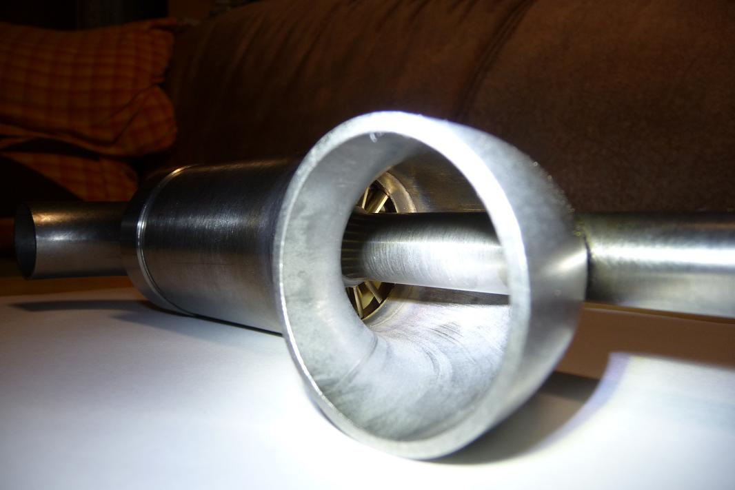 Vlevo vstupní koleno 28x1,5mm a vpravo výstupní koleno 42x2mm . Z celého hřídelé je vidět pouze náboj k pohonu generátoru . Zítra dokončím přírubu genátoru , osadím ji a konečně otestuji stlačeným vzduchem