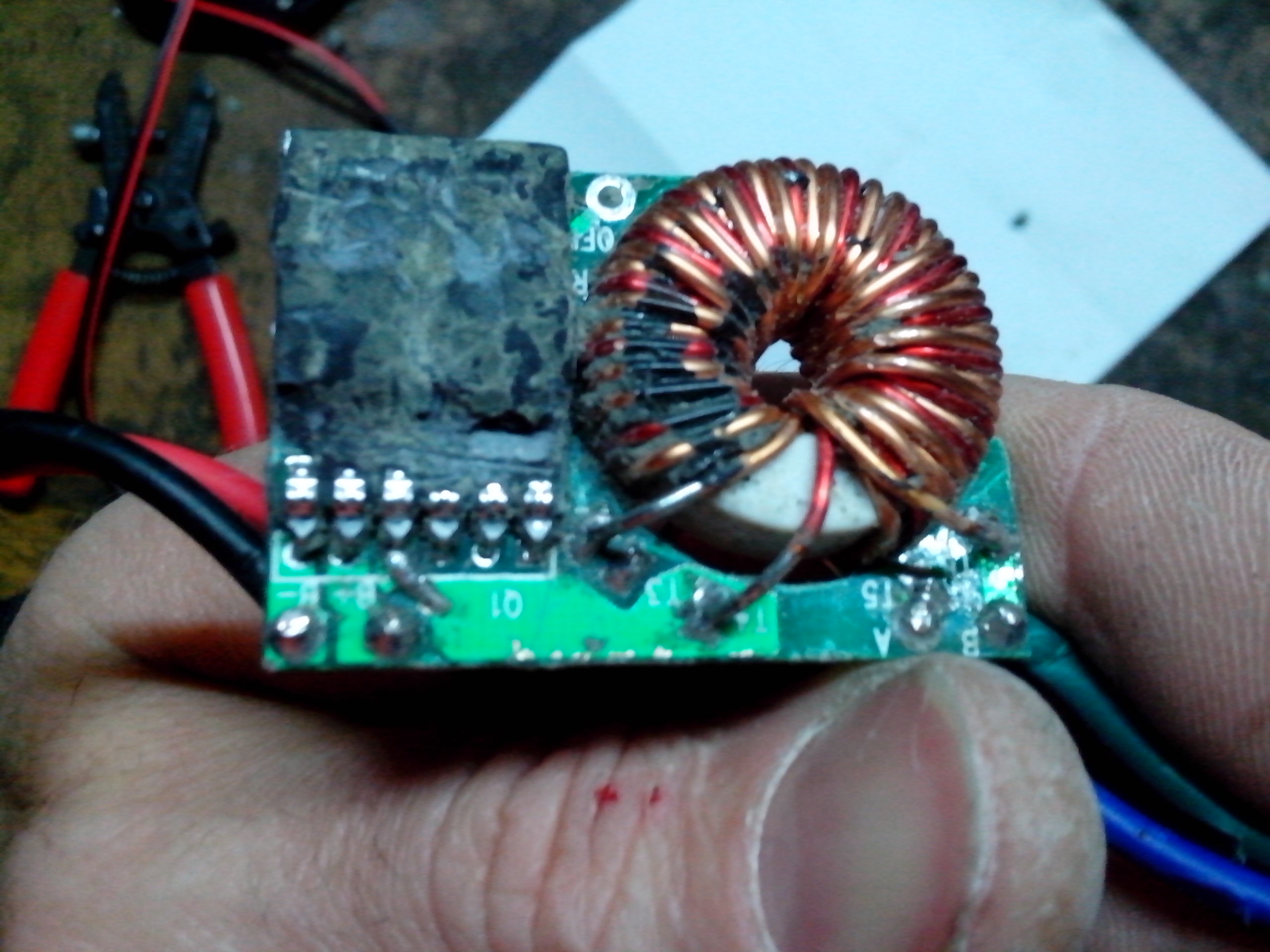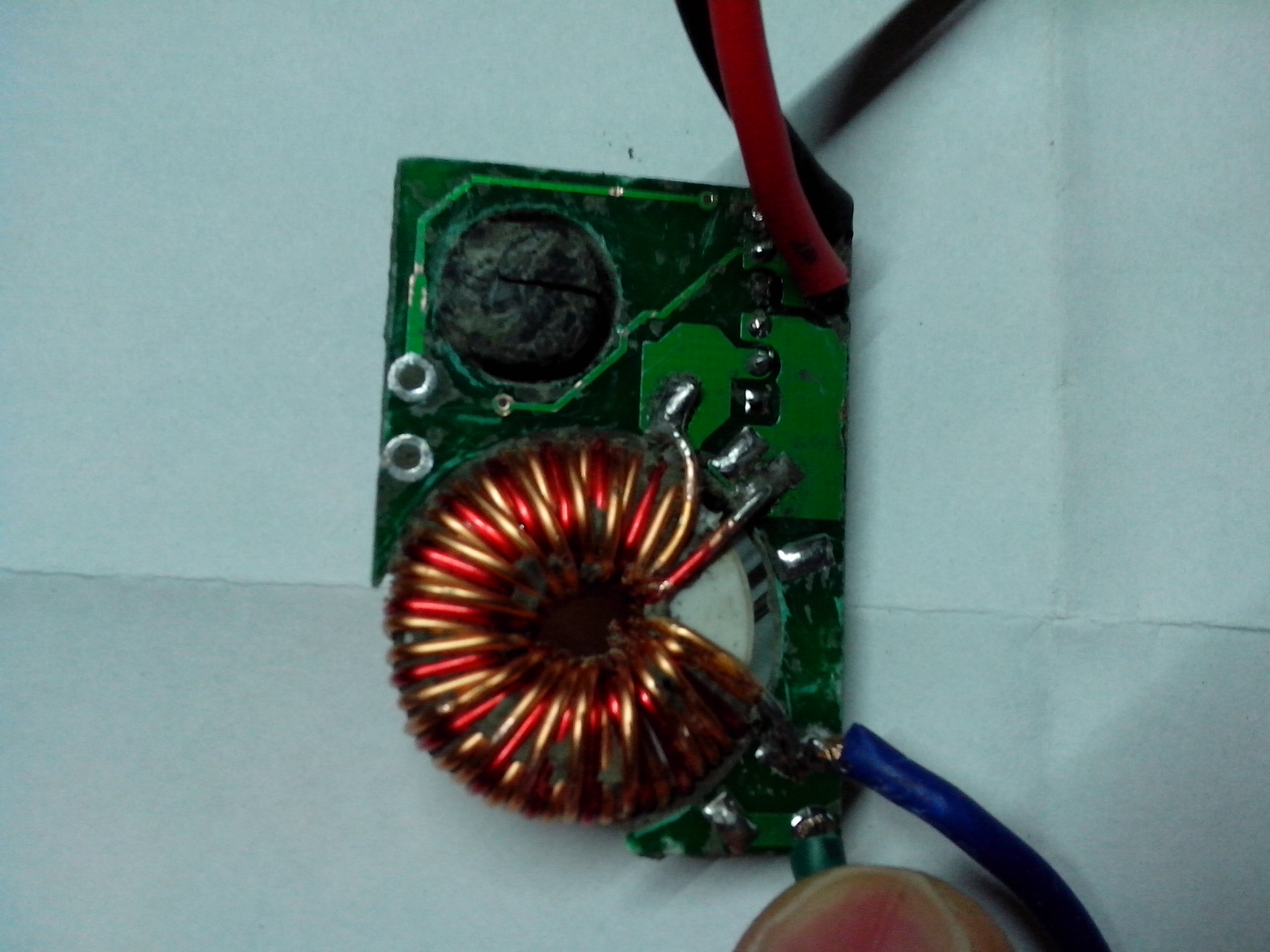To Marko: není to moc vidět, ale jeden konec žlutýho drátu z trafa je přímo na B, druhej je kam? typoval jsem, že bude přímo na A... Červenej drát trafa je na + článku, druhej konec pravděpodobně na D fetu, S bude na -, možná přes nějakej pidiodpor, ale spíš ne. Pak už jenom odhalit trochu to buzení a je to. Hodnoty SMD kondenzátorů stejně nikdo nepřečte, ty se musí odpájet a změřit. Možná to bude ještě blbější než si dokážeme představit, ta malá cívečka naindukuje napětí pro G přímo na pracovní frekvenci a nějakej tranzistorek to jenom sepne...