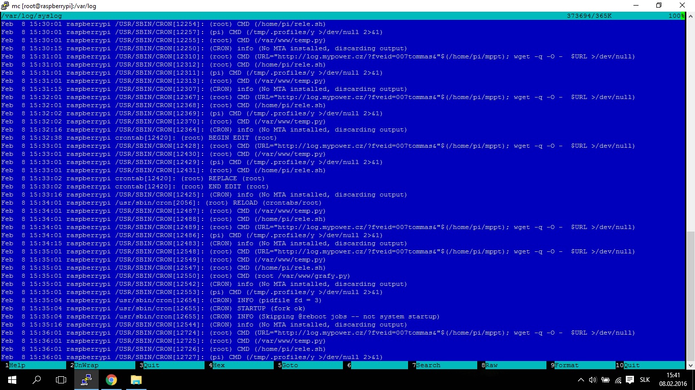 Ahojte, mám taký problém. Mám skrip ktorý vytvára graf na teplotu skriptom jeho zapisovanie do databázy púšťam každú minutu. Ďalej mám skript ktorý sa spúšťa každých 5 minút aby vytvoril graf pre web. Problém je v tom že keď príkazom ./grafy.py spustím skript tak sa graf vytvorí. Ak ho ale dám do cronu tak sa nespustí, skúšal som ho spúšťať každú minutu, každých 5 každých 15 a stále sa cez cron nepustí. Pridaný ho mám v crone pre root takže tam si myslím problém nieje. Pre spustenie kažých 5 minút používam */5 * * * * /var/www/grafy.py. Vedeli by ste mi prosím vás čo môže problém spôsobovať? Neni problém v tom že sa nachádza v var/www/? Ďakujem.